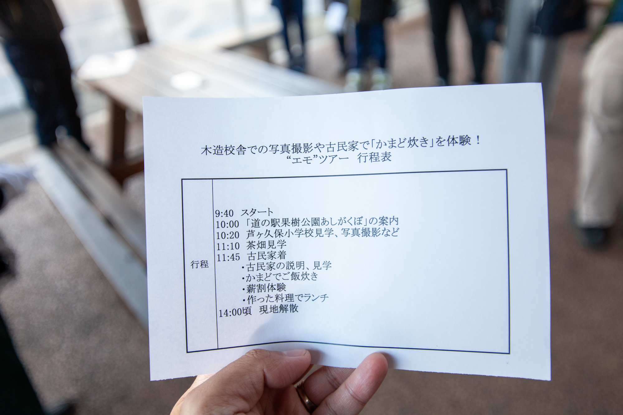 こちらがツアーの日程表です。芦ヶ久保小学校の見学・写真撮影から、古民家でのかまど炊き体験。14時ごろ解散と、約半日コースとなります。