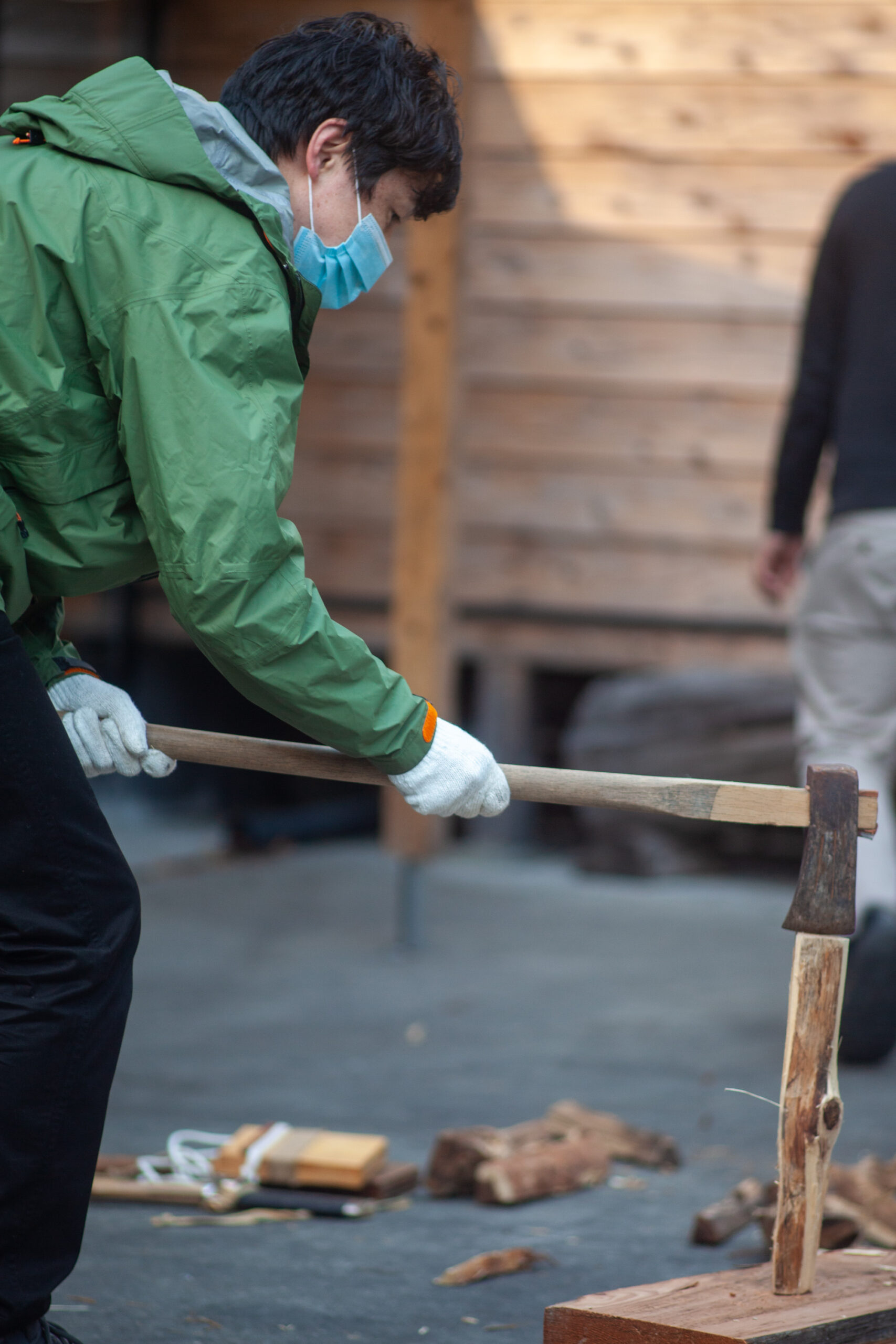 お米を炊くチームと、豚汁を作るチームに分かれ、手が空いた人から薪割りを開始します。