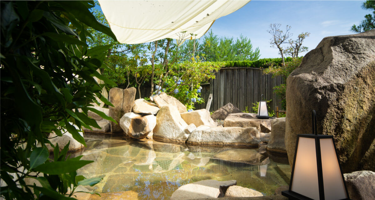 温泉のある地は「岩倉」と名前がつくほど、岩の多い場所。露天風呂は、その山々にあった岩で作られています。