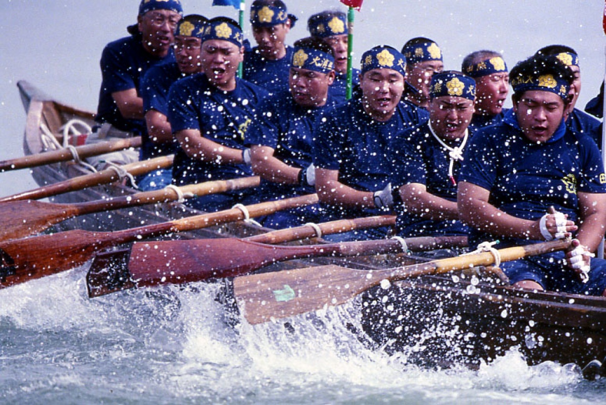 一方、昼に行われる「海まつり」の見どころは、村上水軍が伝令船として使用したという木造船「小早(こはや)」の競争レース。1つの船に16人が乗り込み、1キロの距離で速さを競います。