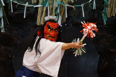 この夜神楽に登場するのが、先ほどの神話でもご紹介した、天照大神をはじめとする神々たち。神話や伝説の神々が33もの舞の中に総出演しています。