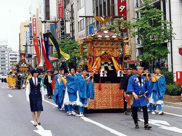 山王祭は、初日の末社・八坂神社の例祭に始まりますが、一番の見所は「神幸祭」です。御鳳輦2基、宮神輿1基、山車3基と総勢500人もの王朝装束をまとった行列が、皇居、東京駅周辺、銀座などかつての江戸城内23kmの距離を9時間かけて巡行します。また、日本橋~京橋地区を威勢の良い17基もの神輿が練り歩く「下町連合渡御」は、江戸の下町の心意気を感じられる催しです。