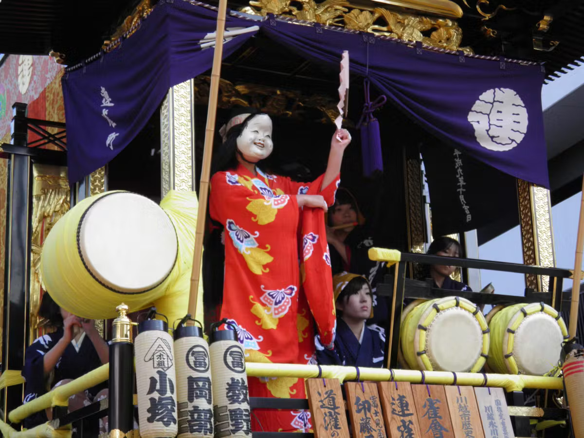 佐原市と同様、小江戸と呼ばれる川越には、伝統的な蔵作りの町並みが今も広がっています。その町並みの両側に紅白幕が張り巡らされ、笛、太鼓、鉦の音に合わせて上部に人形を乗せた山車が巡行します。この山車は、文化財に指定されているものも多く、絢爛豪華なその姿と歴史的な町並みは素晴らしい調和を生み出します。