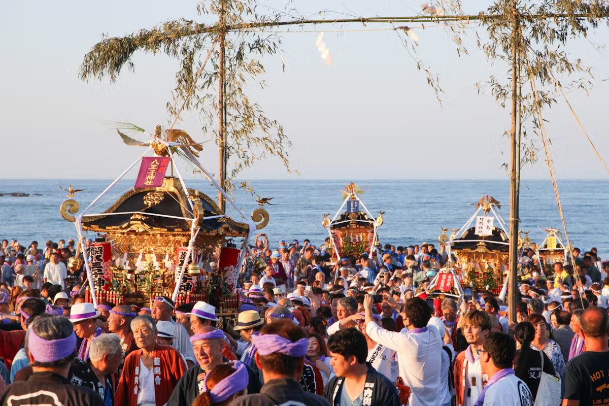 浜降祭(はまおりさい)は、毎年神奈川県茅ヶ崎市の西浜海岸で、7月の「海の日」に開催されます。この地域の各神社の氏子たちが、神輿を担ぎながら一斉に海に入っていく迫力のある祭事です。