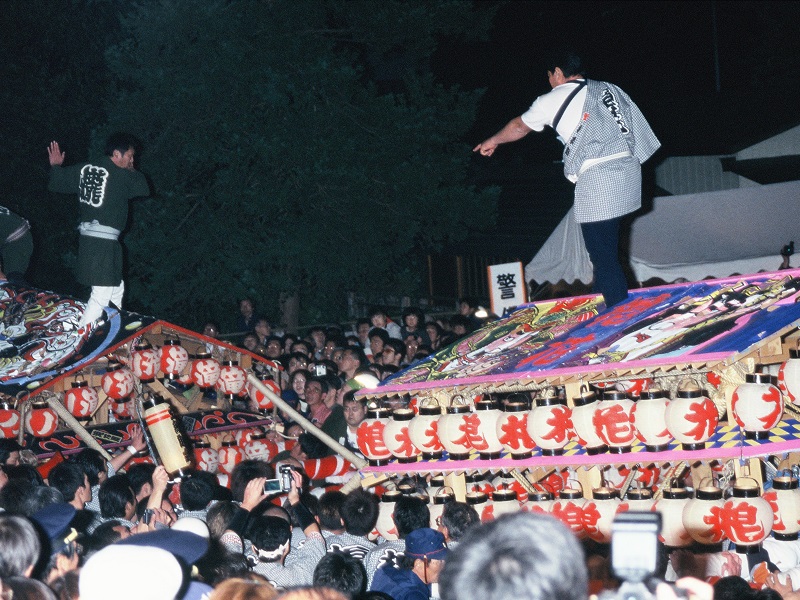 大正末期から昭和初期には他の地区も参加し、屋台のぶつけ合いが始まったのは昭和8年から。祭りの宮入りの際「神社に神輿が納まってしまえば祭りは終わる」という寂しさから、それを防ごうとする2つの屋台がぶつかったことがきっかけなのだとか。