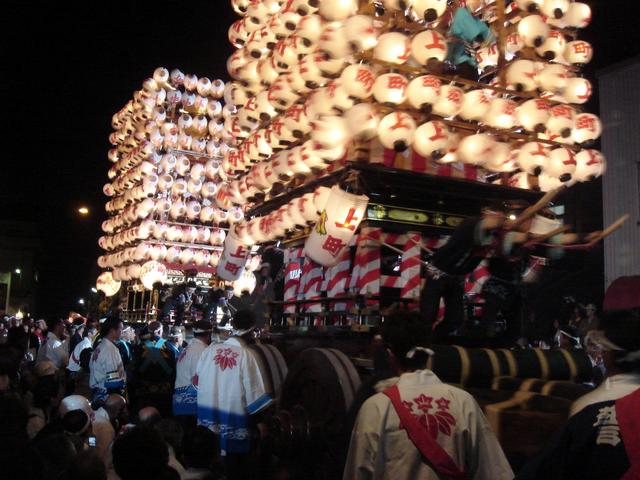 祭礼1日目は、八幡神社で五穀豊穣への感謝と氏子の安寧を祈願する式典が行われます。本祭りは2日目で、神輿が町内を巡幸したのち、夜になると大勢の若衆に担がれた6台の屋台が神輿と共に御旅所を出発。神社の境内に入ると屋台同士は激しくぶつかり合い、打ち鳴らす太鼓の音は絶えることなく轟き、提灯が燃えたり屋台が壊れたりしながらも激突が続く様はひたすら圧巻です。