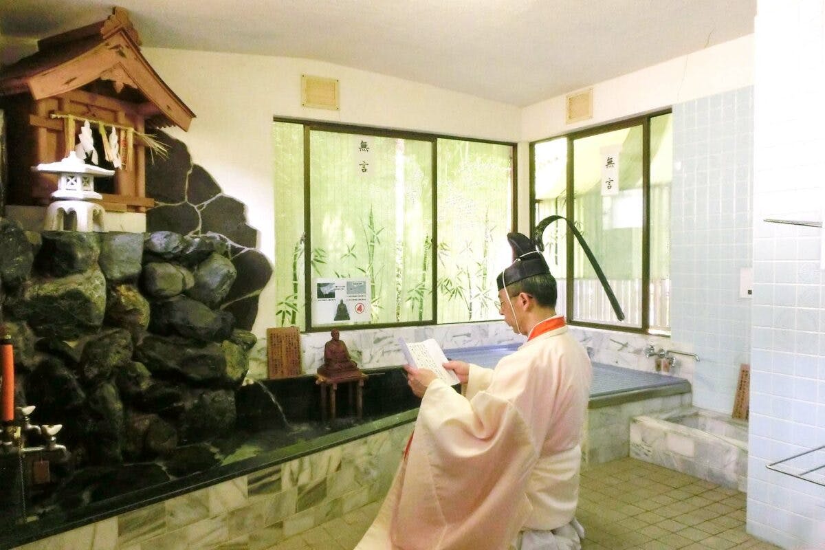 白雲大社には「千と千尋の神隠し」が公開されるよりも前から、全国の神々を招いて入っていただく「お湯屋」があり、神様のご神徳を称え感謝を伝えるため薬湯を沸かします。祭典後に入浴、足湯に浸かった参拝者からは病気が治ったとの声も。お風呂の御神札も授与されます。