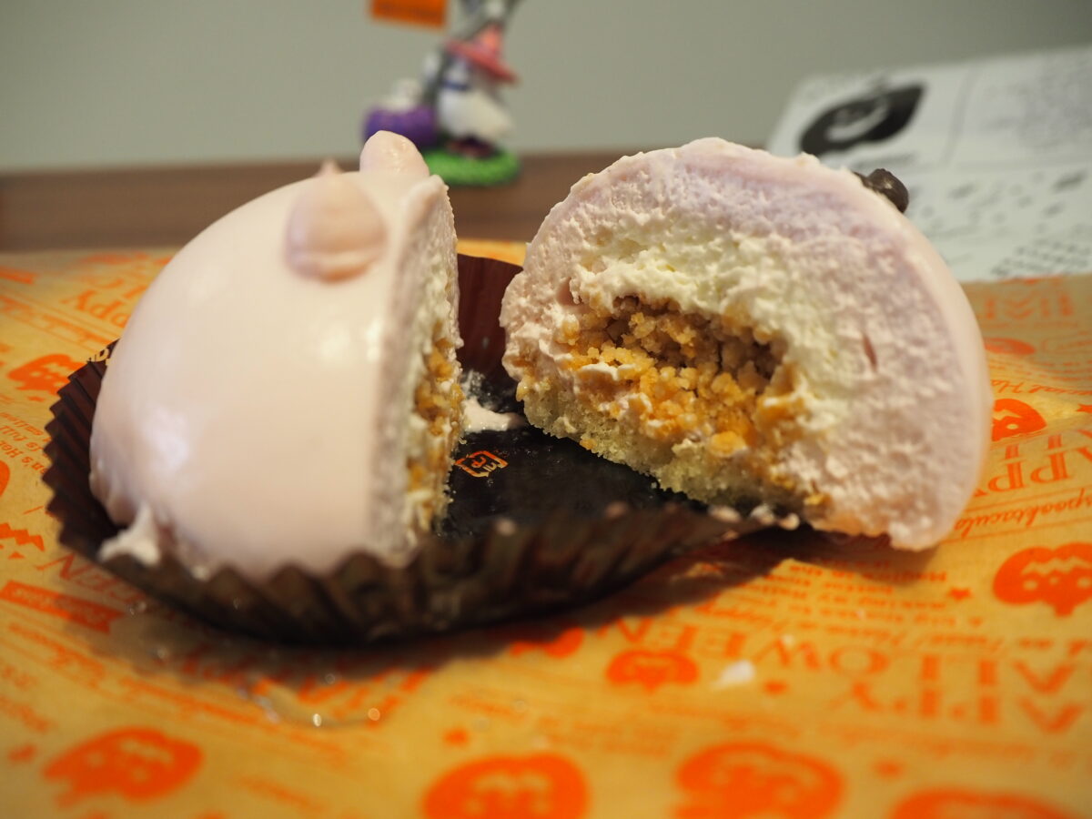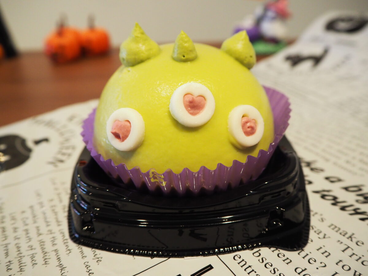 ・外側のクリームはメロン味で美味しい!中に入っているザクザクしたのはなんだろう?あと、真ん中にあるゼリー部分は、メロン味なのかな?? 不思議で面白いハロウィンらしいスイーツ!(40代女性 営業職)