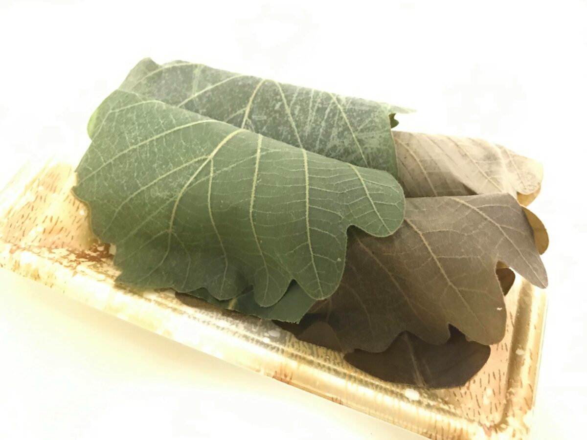 ややくすんだ色の葉に包まれているのがよもぎつぶあん(写真右)、青々とした葉に包まれているのがつぶあん(写真左)です。