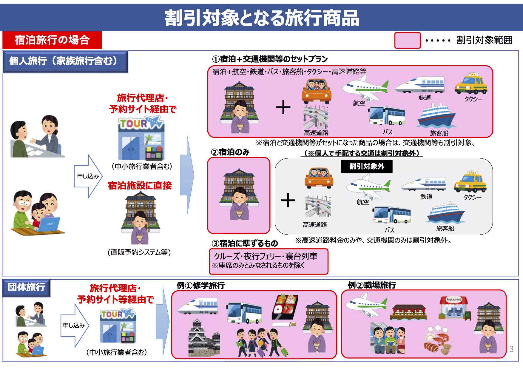 まず宿泊の場合。旅行代理店を通して予約した場合でも、個人でwebサイトなどで予約した場合でも、宿泊施設の料金は基本的に支援の対象となります。交通機関については、個人で手配するサービス(電車やレンタカーなど)は割引の対象の範囲外。しかし旅行代理店で申し込んだツアーなどで使う交通機関は割引の対象となります。
