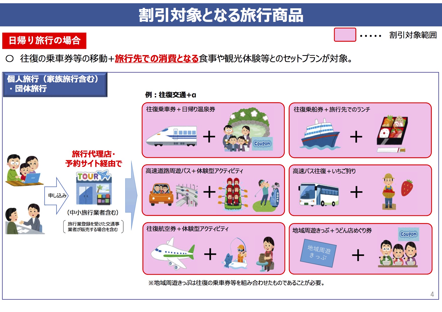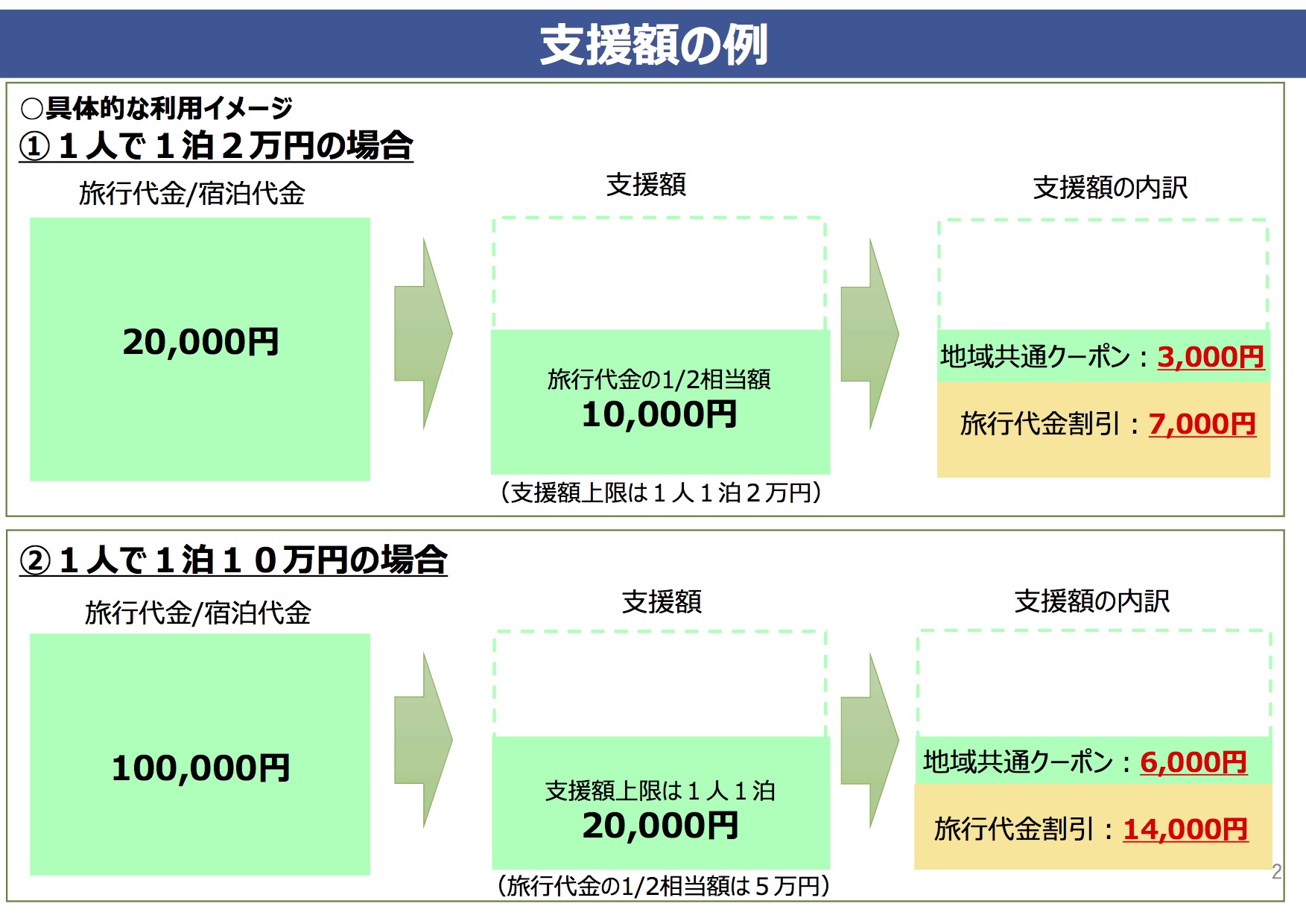 また宿泊・日帰り旅行代金の1/2相当額を支援、とされていますが、上限は2万円、日帰り旅行では1万円と規定されています。無制限の支援ではないということですね。