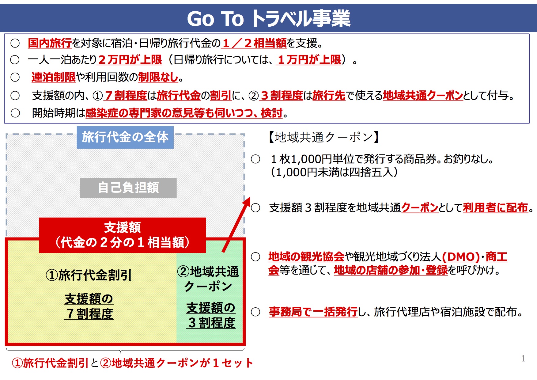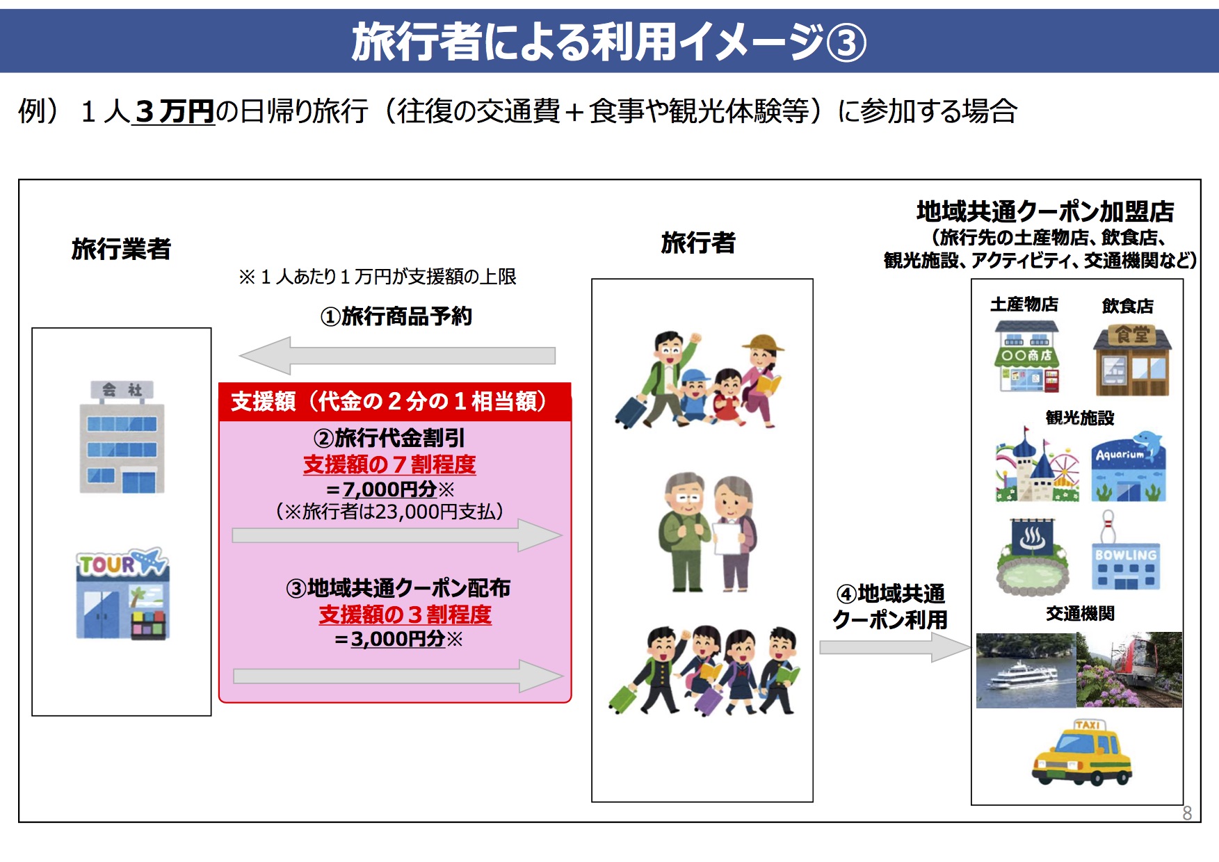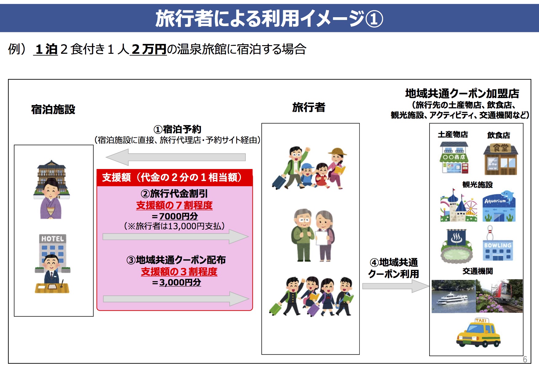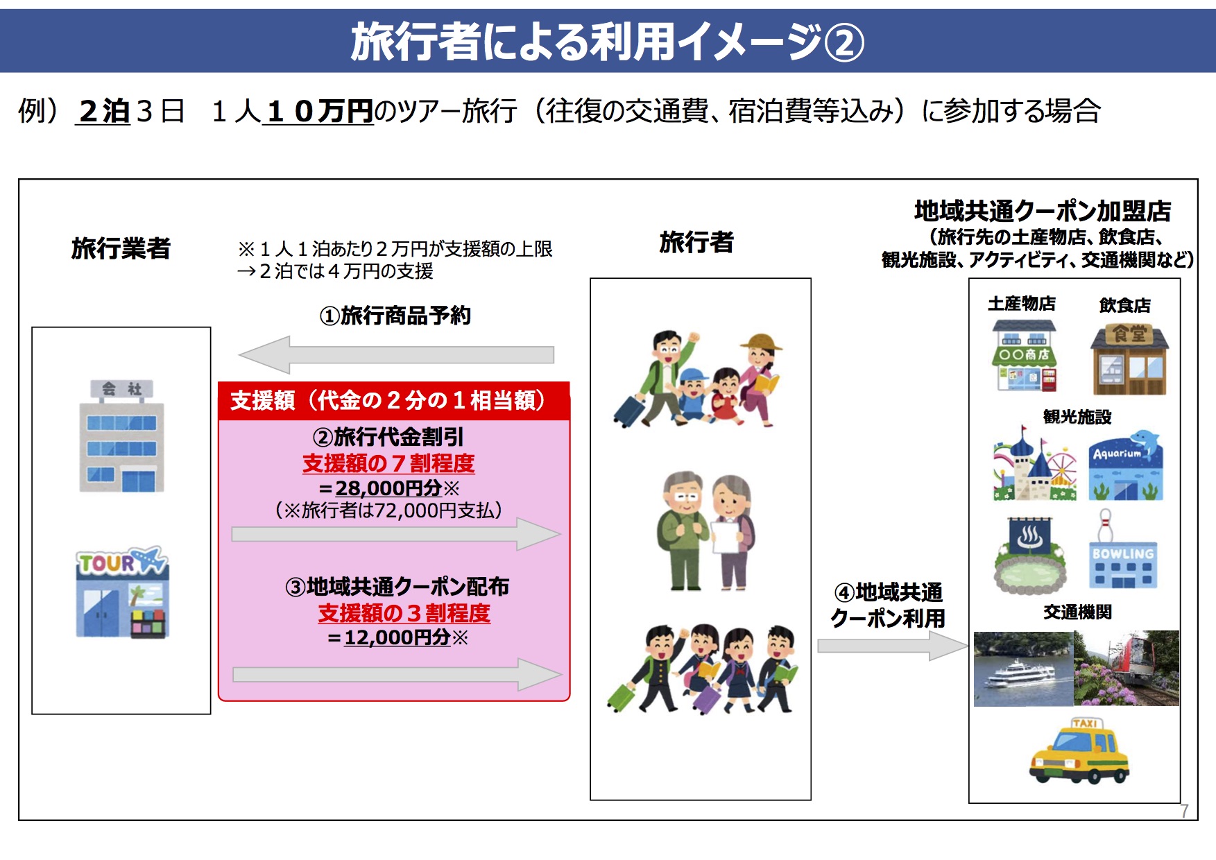 ・「支援額の内、①7割程度は旅行代金の割引に、②3割程度は旅行先で使える地域共通クーポンとして付与。」