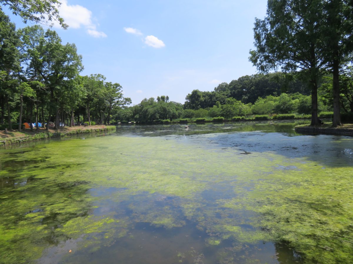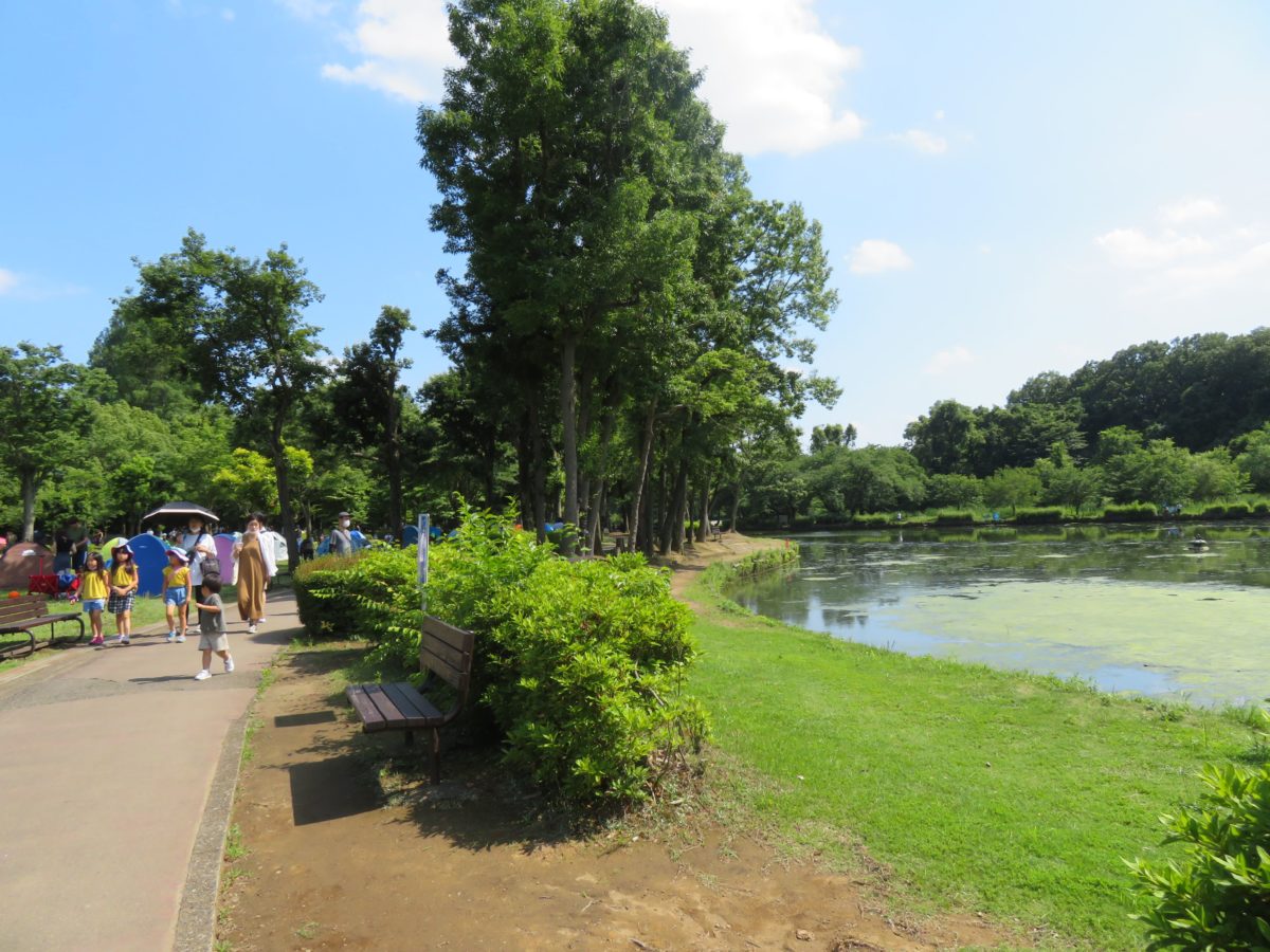 上尾丸山公園の中央で穏やかな水面を湛える修景池
