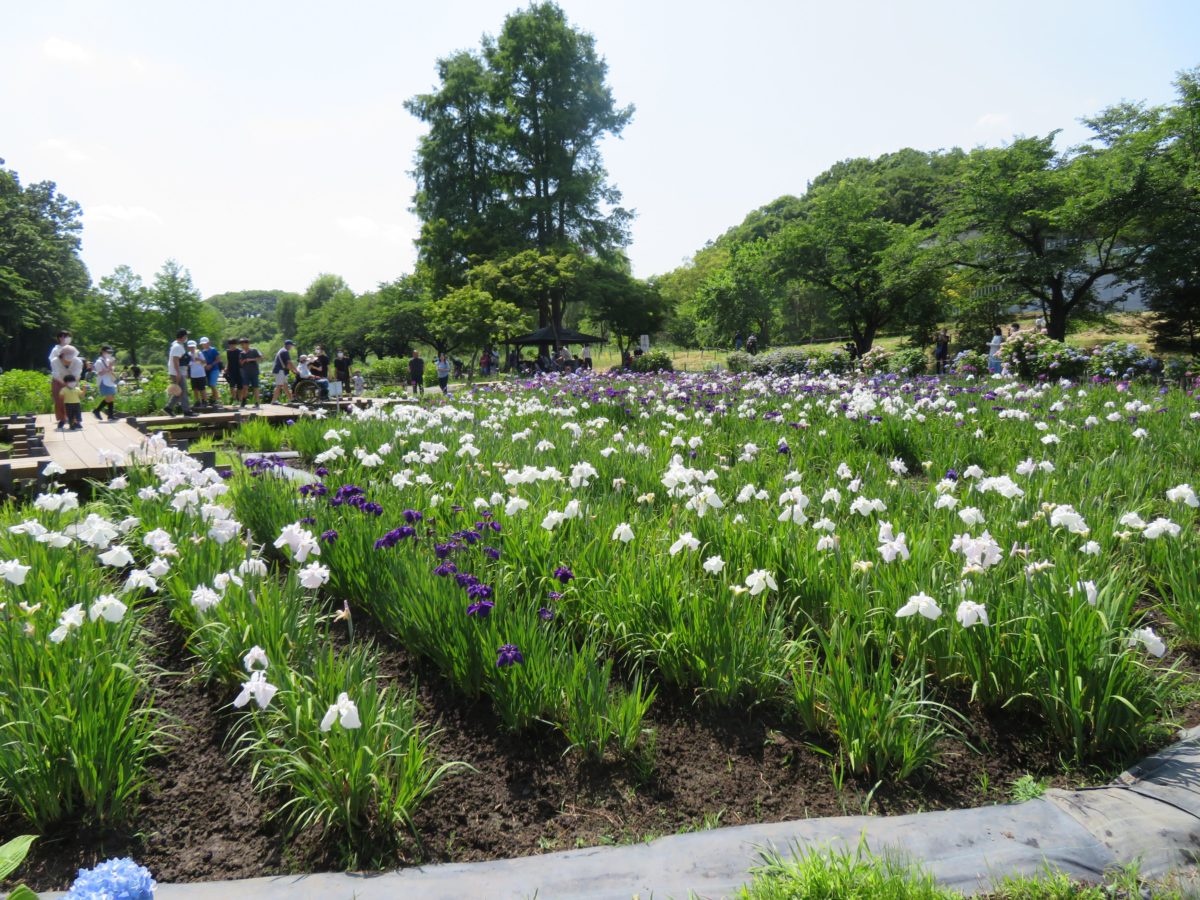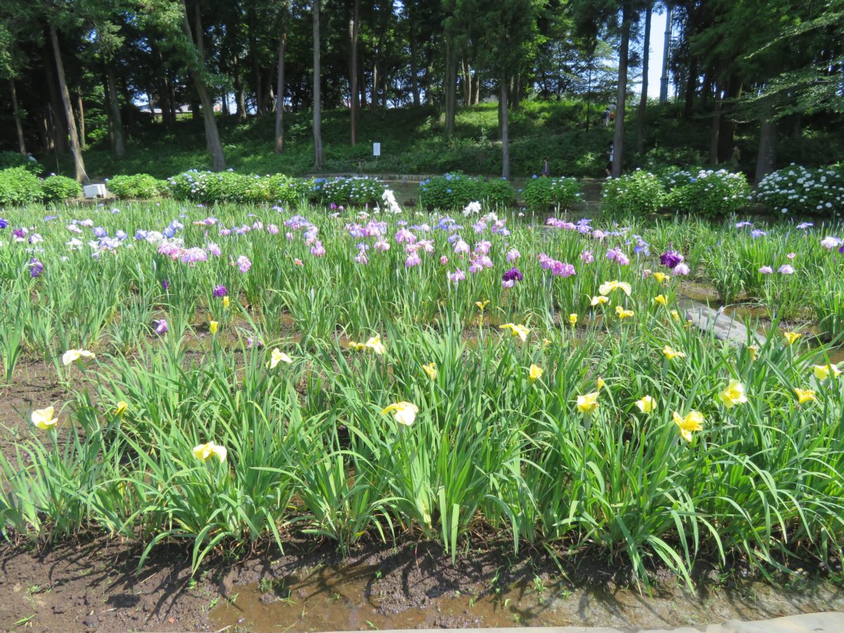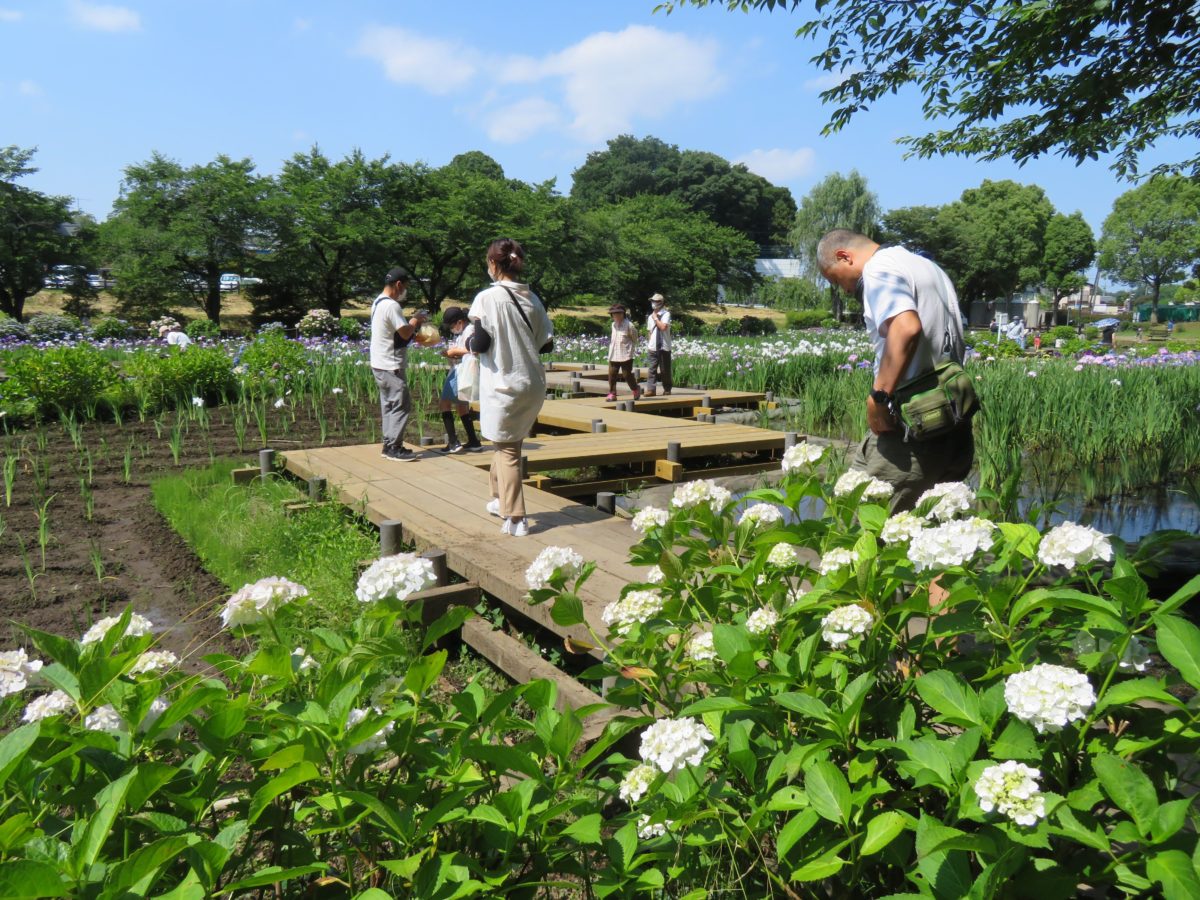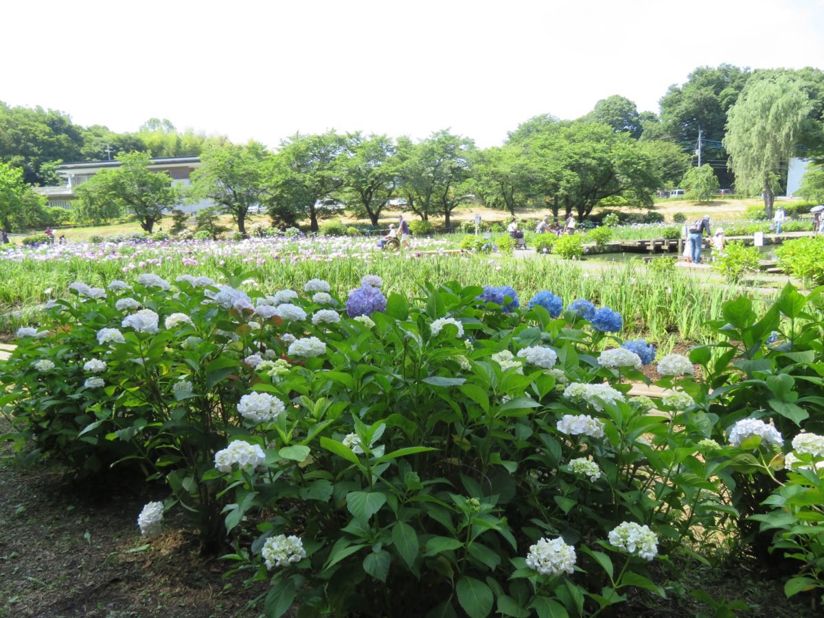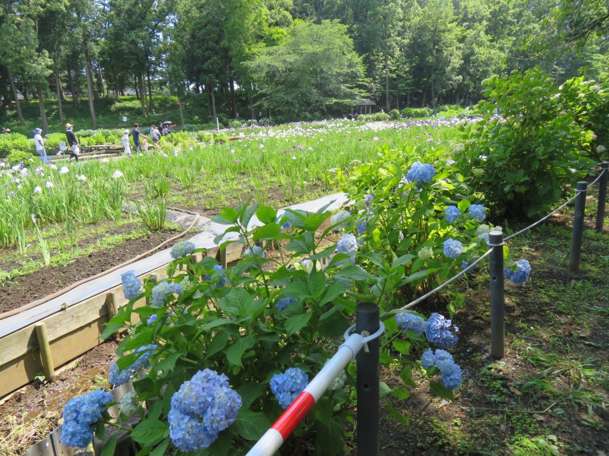 花菖蒲田の東面、西面にはアジサイが同時に花を咲かせ、異なる姿や色彩で初夏の訪れを裏づけているようです。