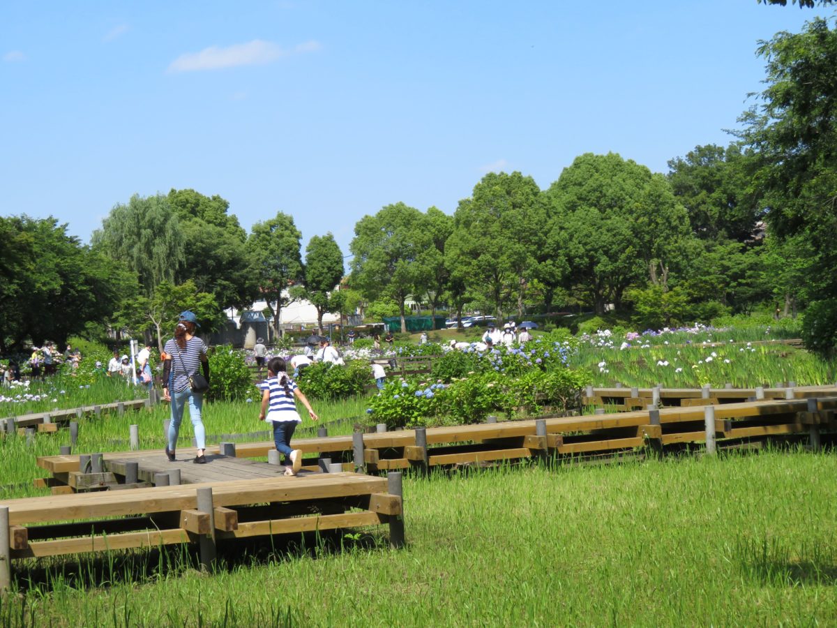 花菖蒲田の中に設けられた木道を歩くと、色模様が少しずつ変化します。ジグザグの木道を駆ける子ども達の姿をあちこちで見かけることができます。