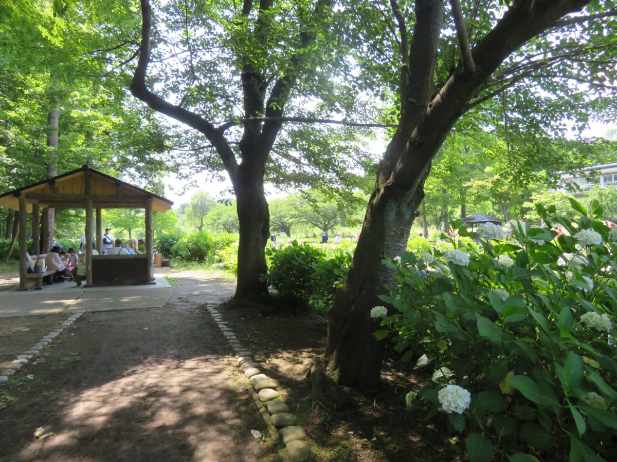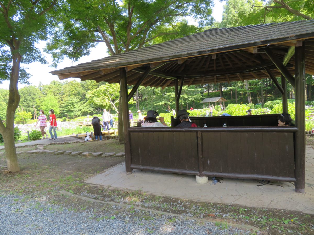 アジサイの列に寄り添うようにあずまやが設置されているので、腰をかけながら花菖蒲やアジサイの花を鑑賞することができます。