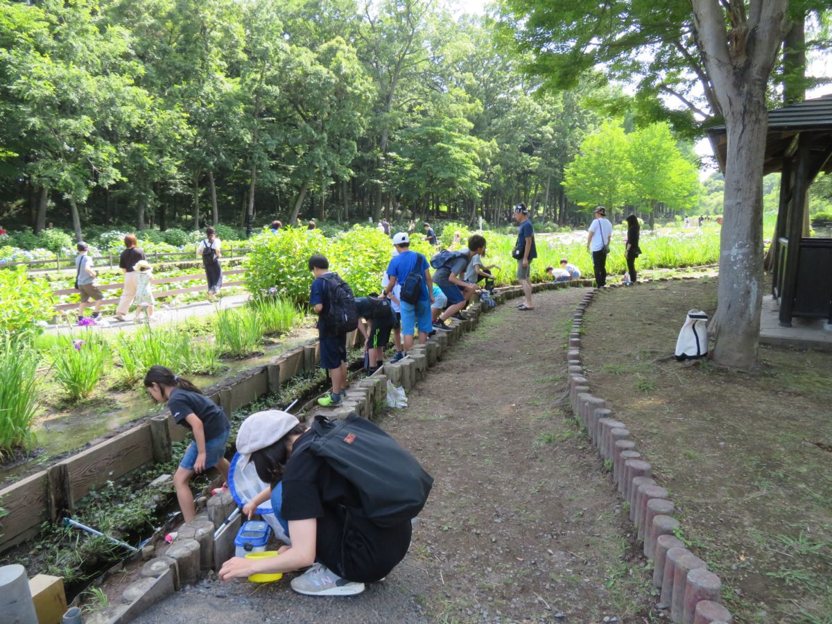 花菖蒲田の西端を流れる水路は、小さな子ども達にとっては水に生きる生物の観察場所となっているようです。