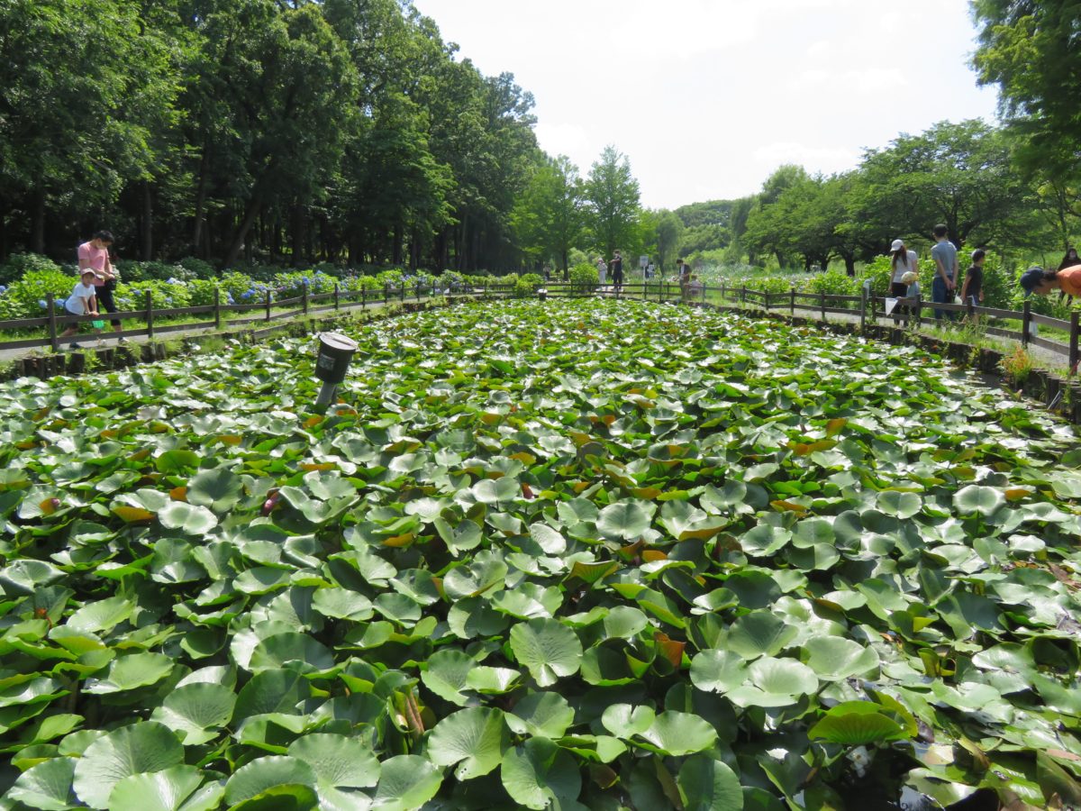 花菖蒲田の南端から公園の中心方向に向かう木道を進むと、蓮池につながります。きっと、花菖蒲に続いて花を咲かせることでしょう。