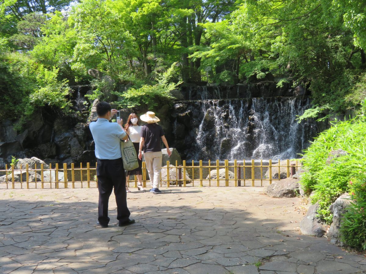 芝生広場の北端では滝が水しぶきを上げ、ここから流れる水が園内を潤します。水のせせらぎは、小さな子どもの格好の水遊び場です。