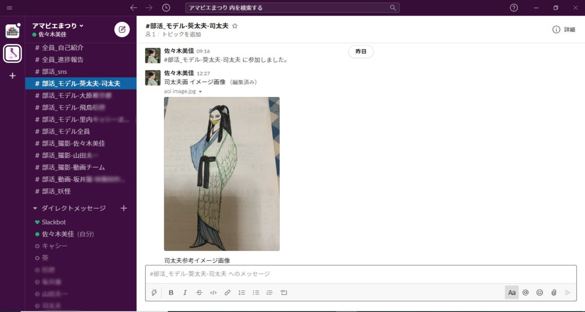 写真:アマビエまつりのSlack 各モデルとの衣装や撮影チームの進捗確認に使用