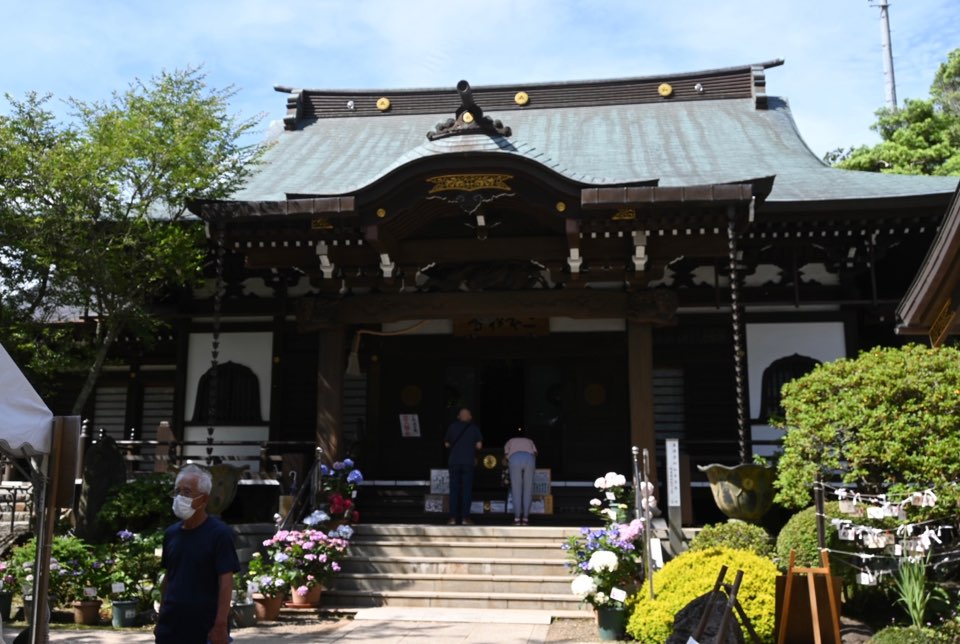 あじさいの杜の散策のゴール、本堂へ到着しました。手水も花手水になっていて、とても華やかでした!本堂でのお参りを済ませたら、あじさいまつり限定御朱印をいただきます。