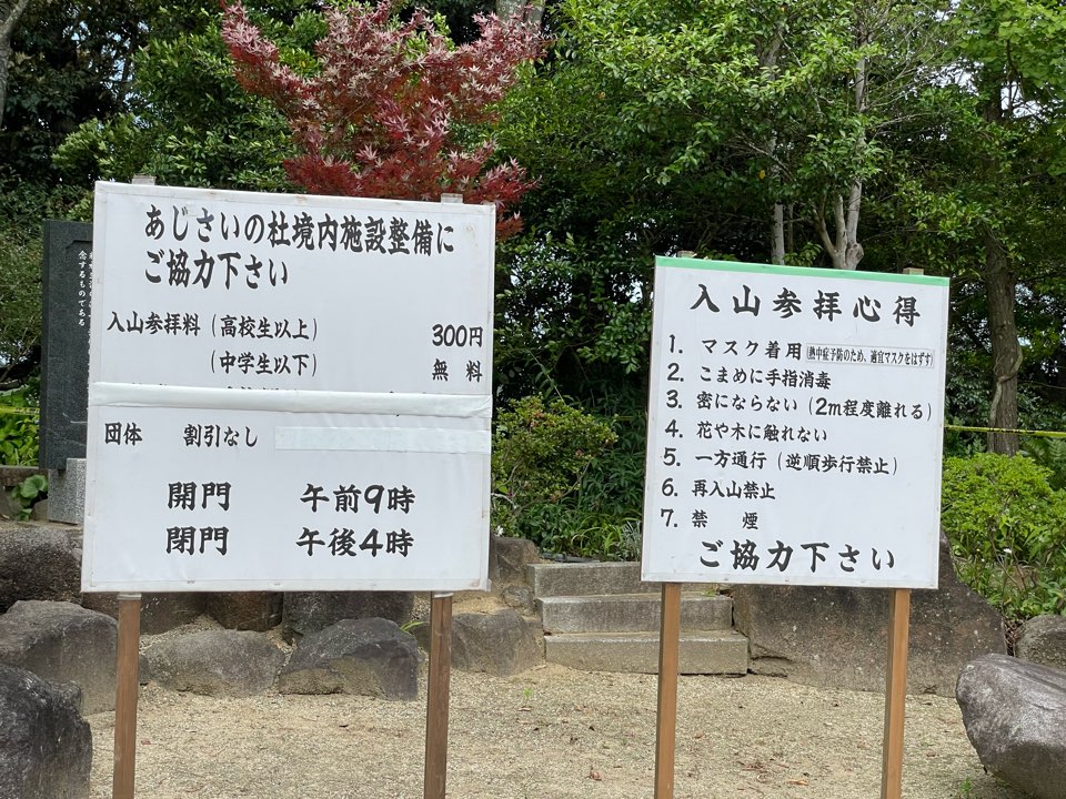 あじさいまつり期間中は、社境内設備管理のため、入山参拝料300円(高校生以上)がかかります。中学生以下は無料です。