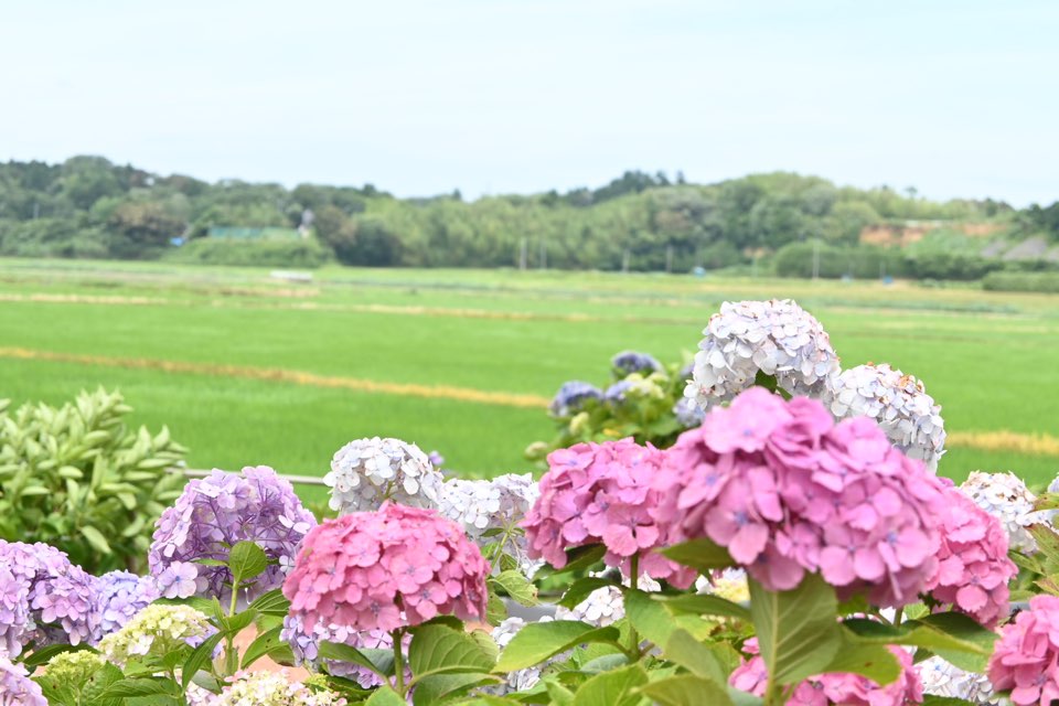 受付から少し歩くと、見えてきたのは、青々とした田んぼとあじさいのコラボレーション。