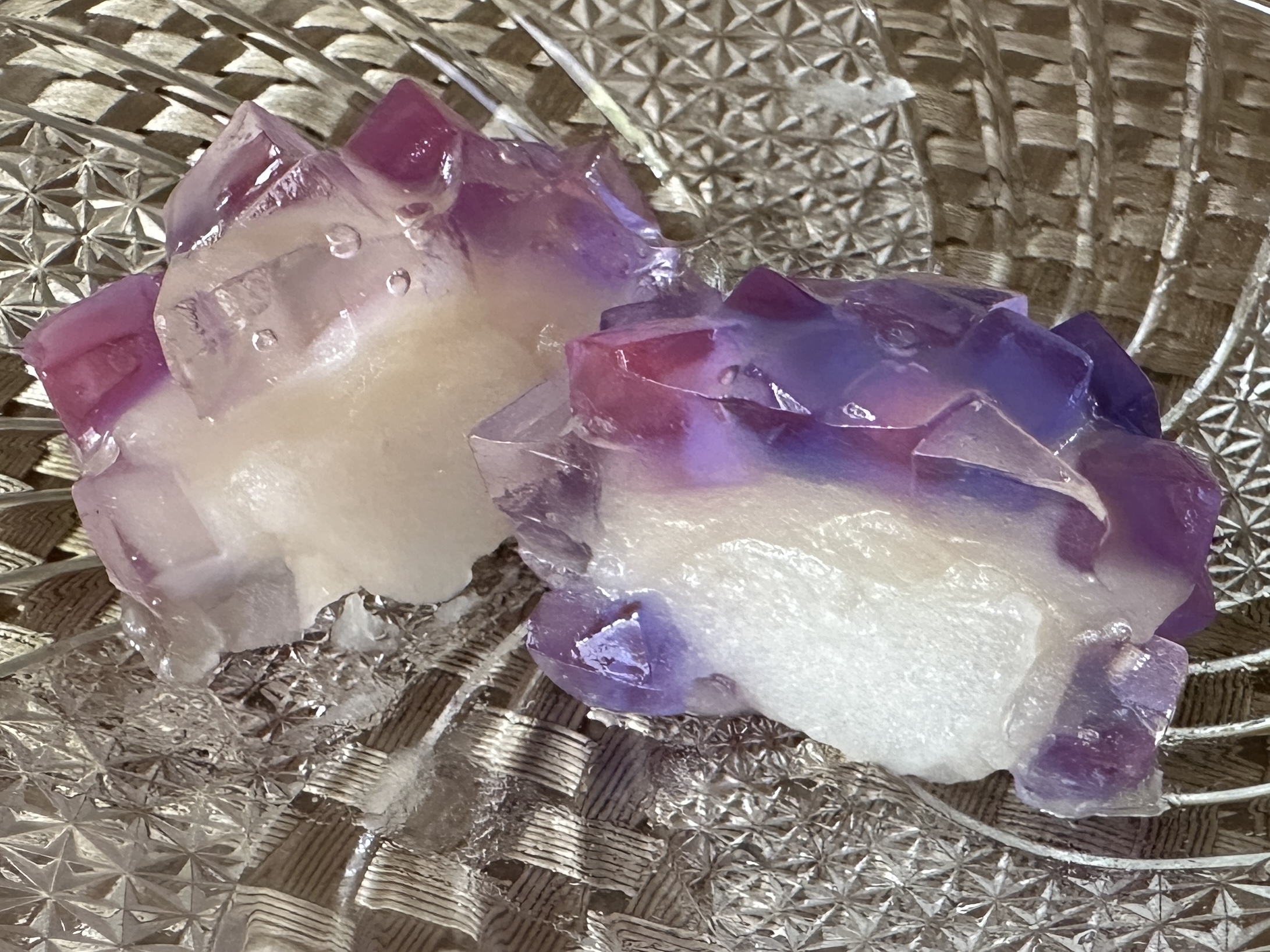 1品目はとらやの紫陽花です。外側は白と紫のそぼろで紫陽花を表現し、また透明感のある琥珀糖を散らしてあります。