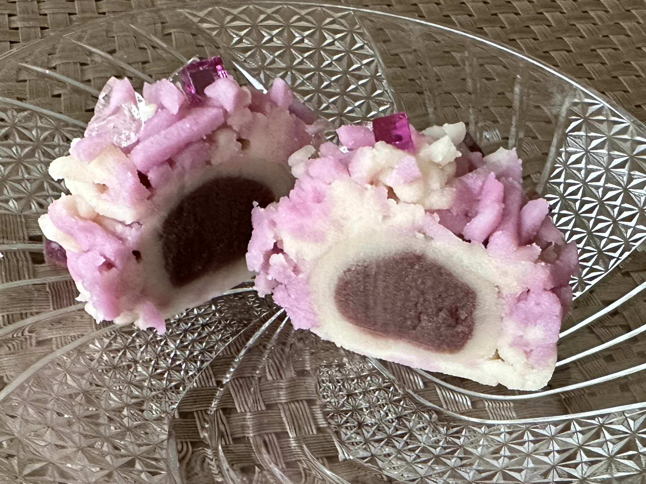 まずは赤紫の紫陽花から。ひと口食べると、色鮮やかな錦玉が口の中でプチプチ弾け、その後に白あんと求肥の上品な甘さが口の中に広がります。美しい見た目に加え、味も絶品でした。