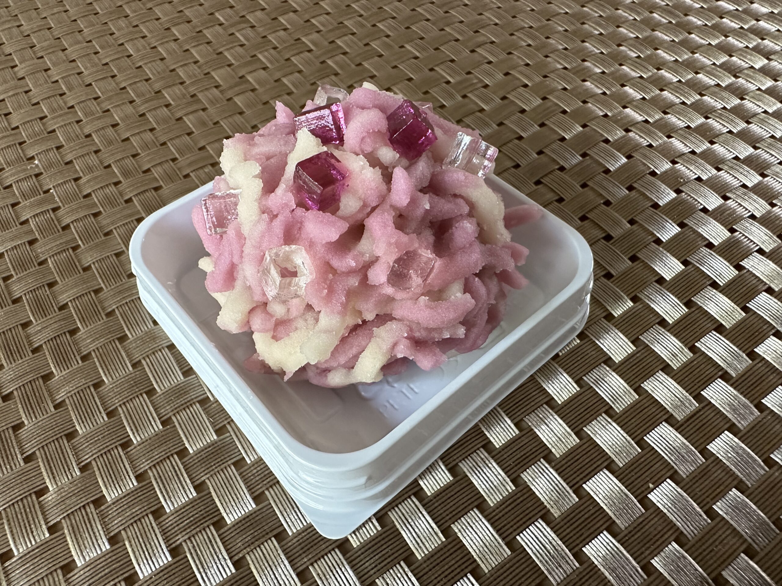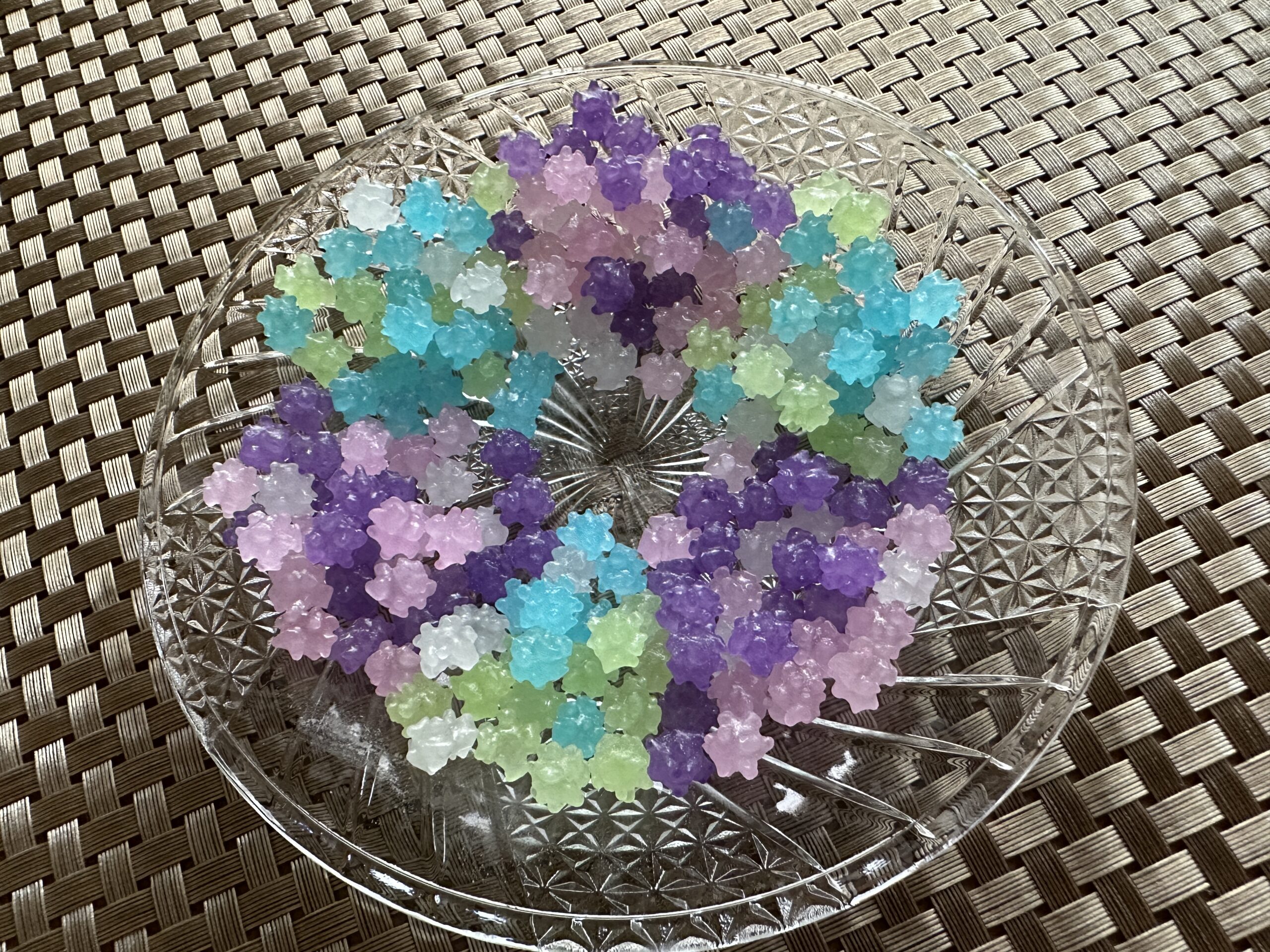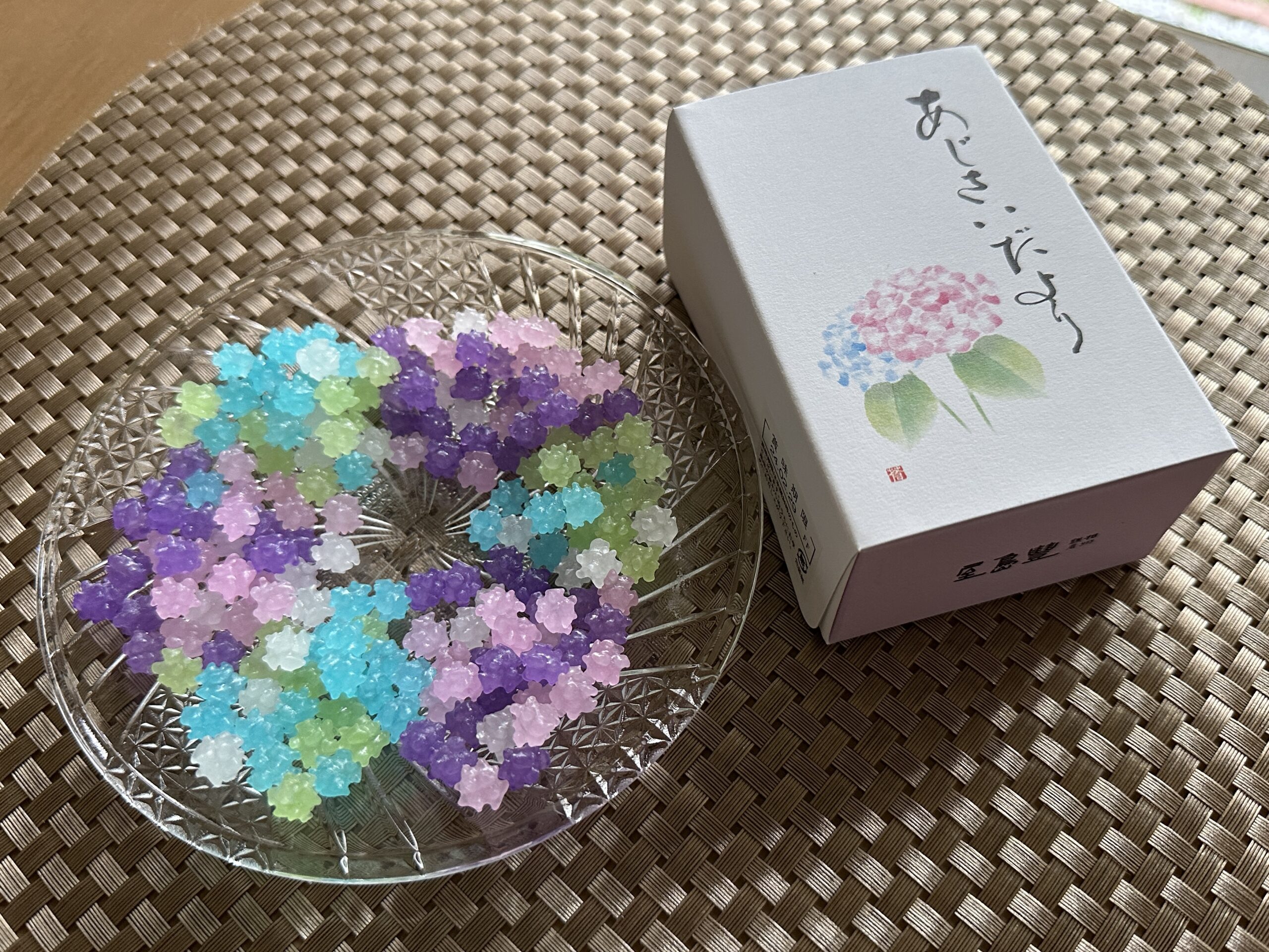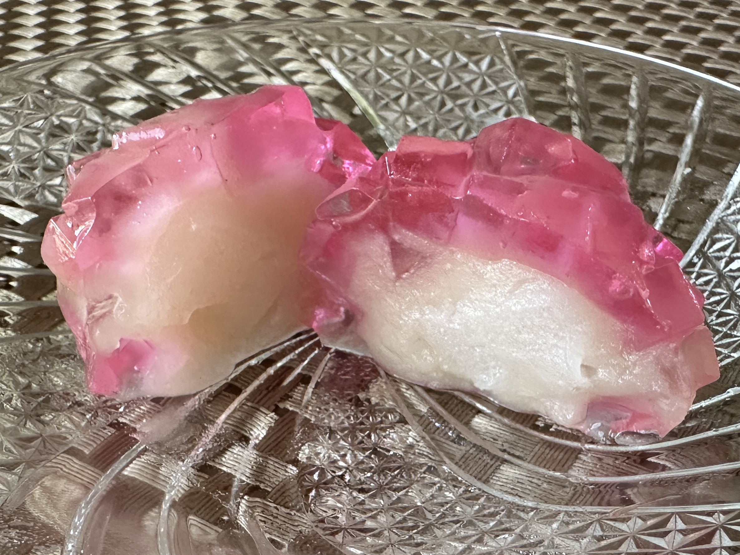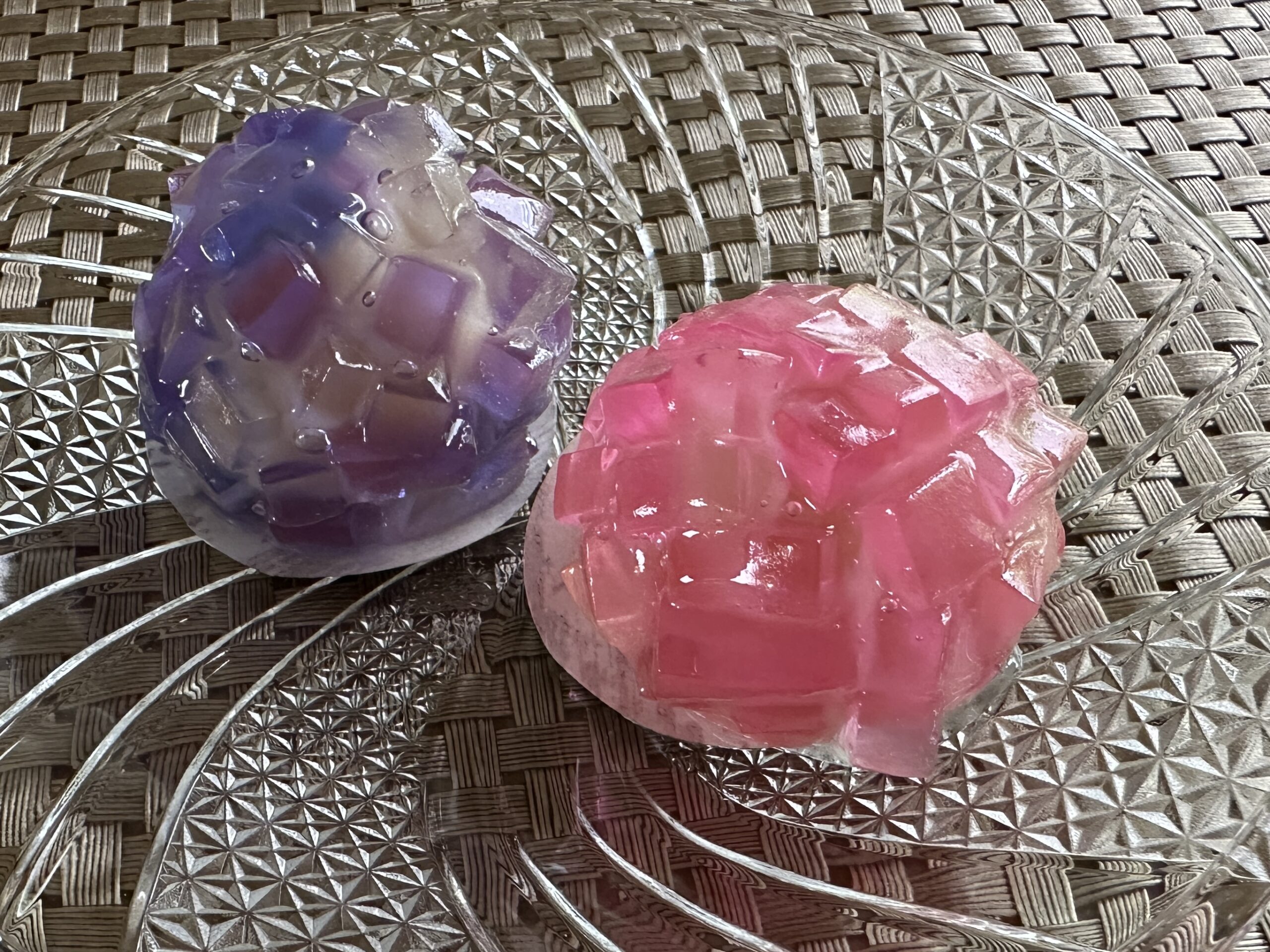 まずは赤紫の紫陽花から。ひと口食べると、色鮮やかな錦玉が口の中でプチプチ弾け、その後に白あんと求肥の上品な甘さが口の中に広がります。美しい見た目に加え、味も絶品でした。