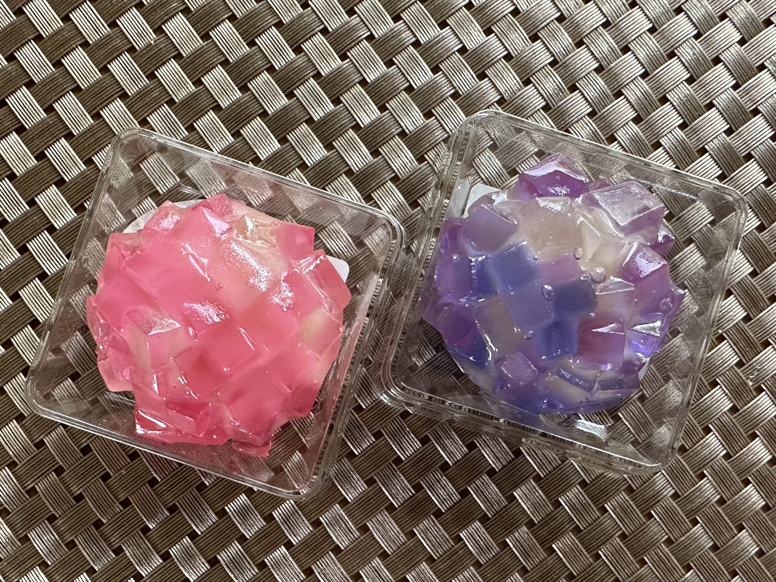 2品目は鈴懸の紫陽花です。青紫、赤紫の2種類を購入しました。透明の鮮やかな彩りの錦玉で紫陽花をイメージし、中身は求肥入りの白あんで包んでいます。