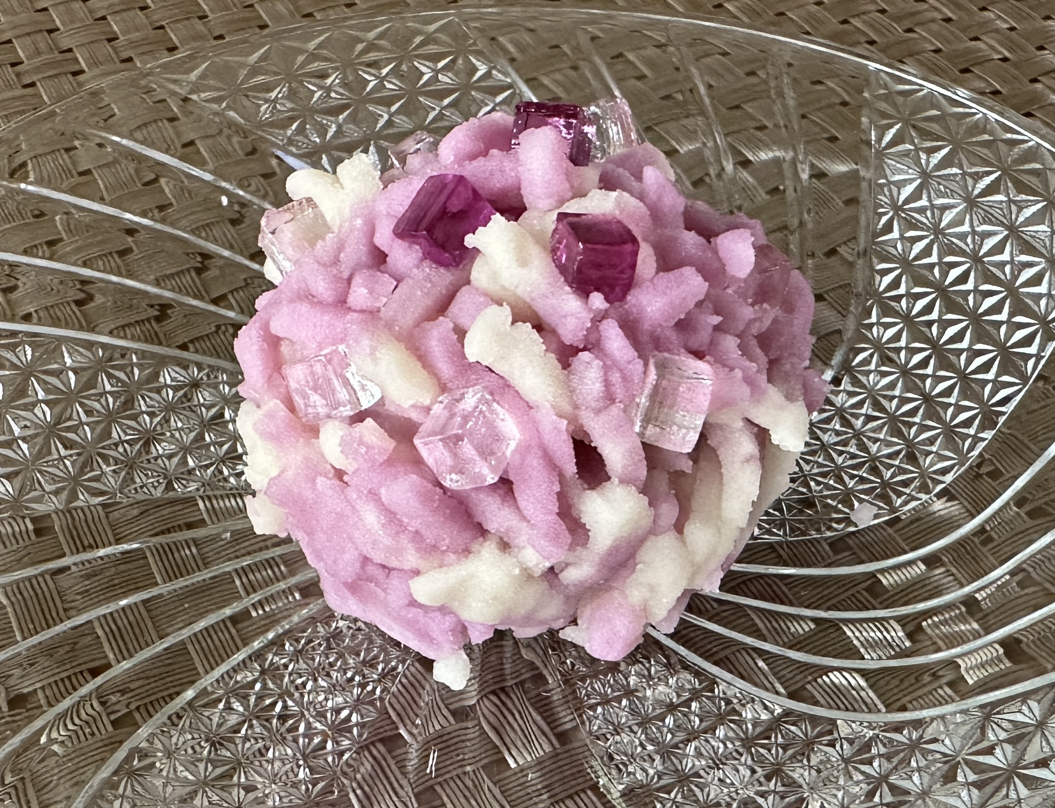 1品目はとらやの紫陽花です。外側は白と紫のそぼろで紫陽花を表現し、また透明感のある琥珀糖を散らしてあります。