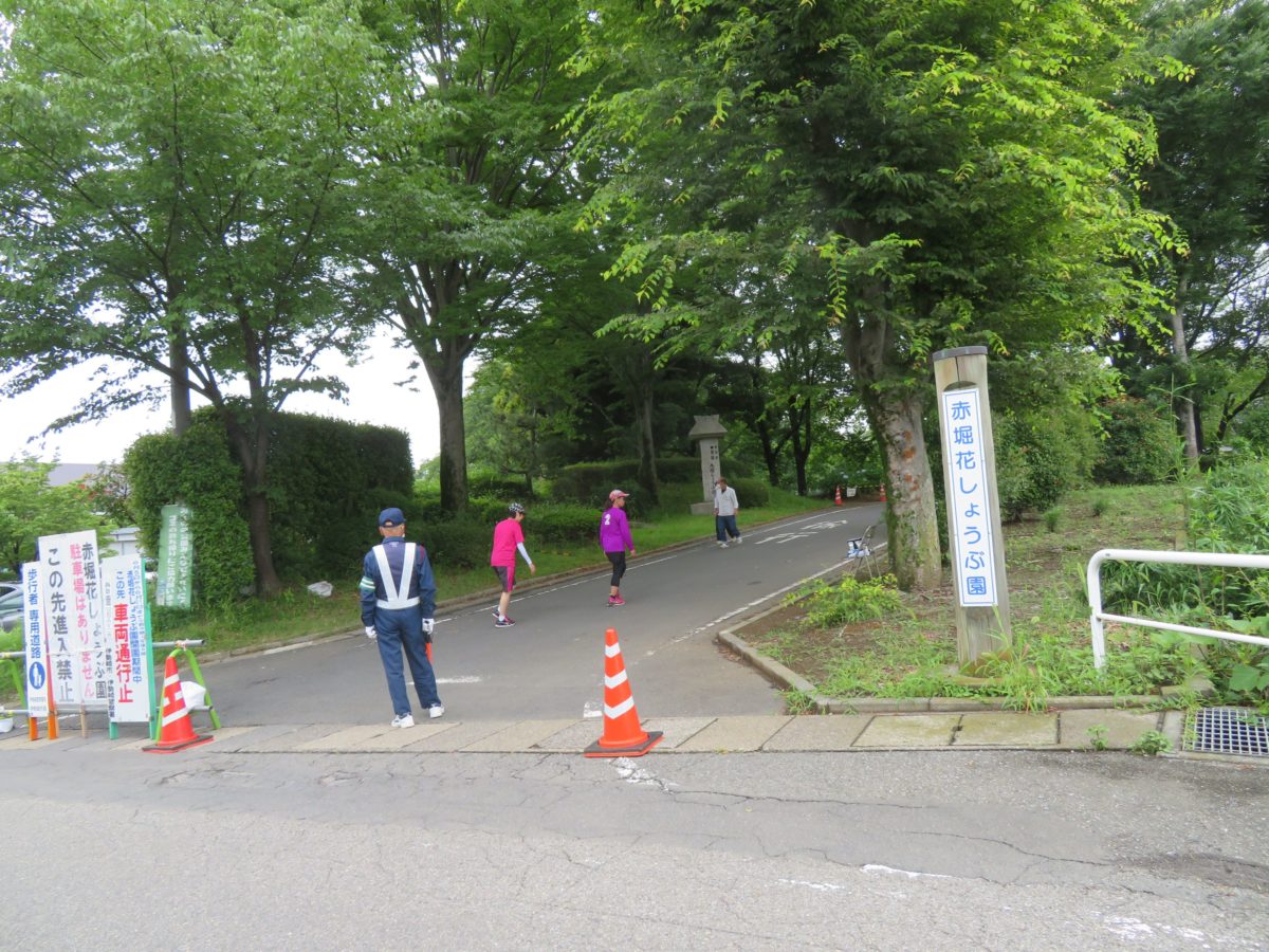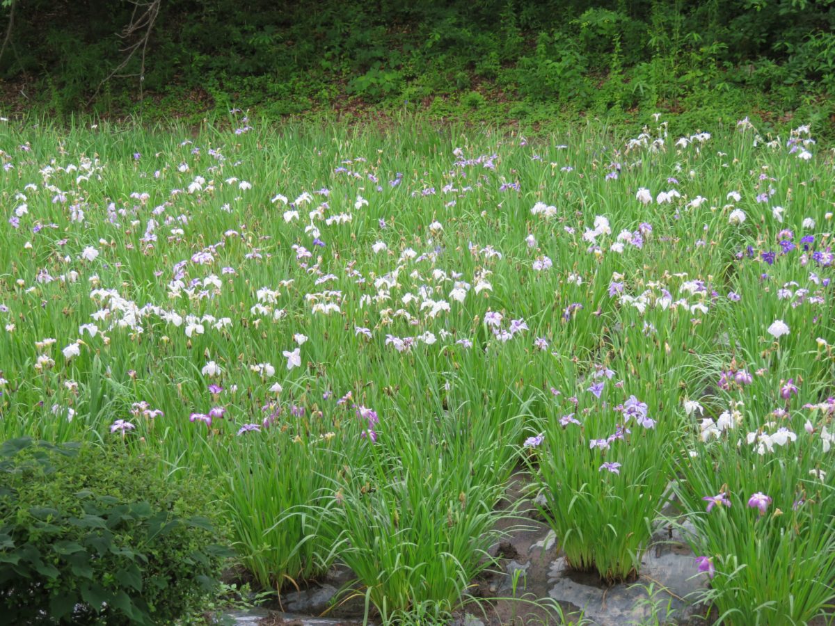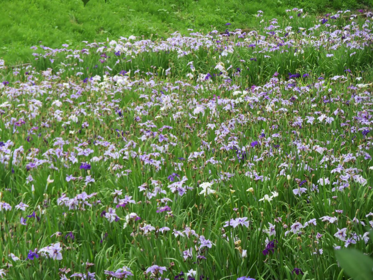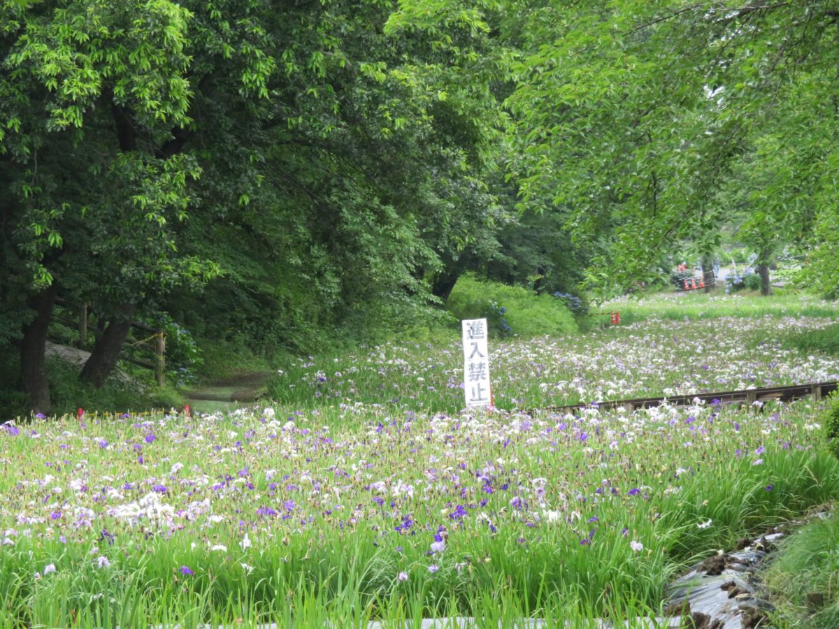 花しょうぶ園の中には木道が設けられ、例年は花園を散策することができます。ところが、2020年は園内への立ち入りが制限され、堀沿いの側道から花しょうぶを眺めることとなります。