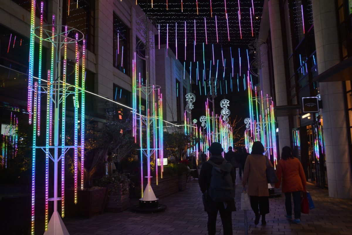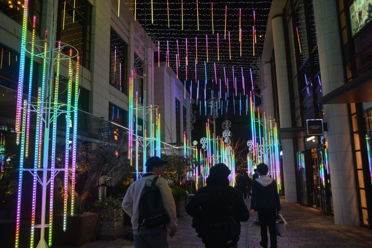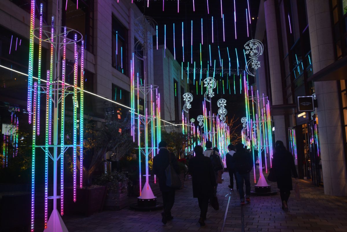 約1670万色の光を放つことができるバーティカルチューブのLEDが並ぶ仲通り