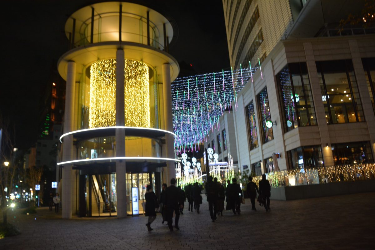 仲通りからのイルミネーションで照らされる赤坂ビズタワー