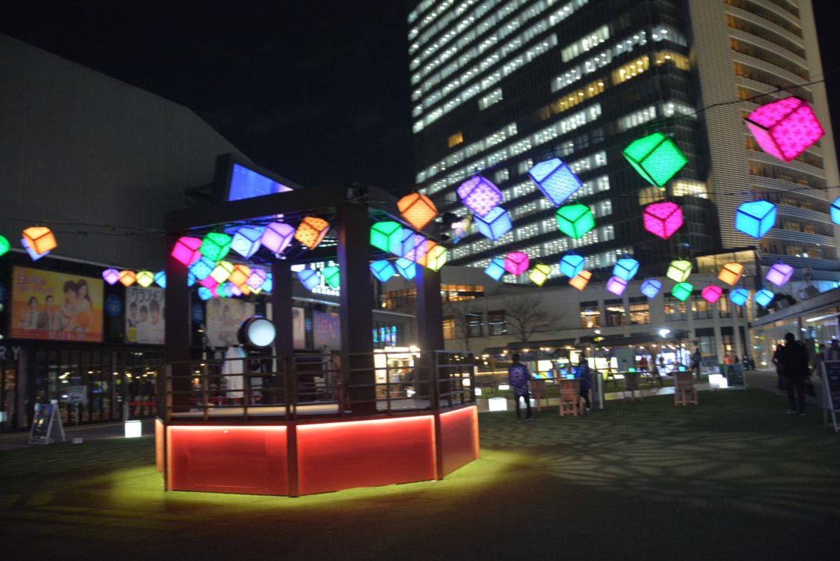 TBS本社前のサカス広場では、提灯型のイルミネーションが頭上で揺れています。広場の中央に設けられた櫓で太鼓を叩くと提灯が彩りを変えるのです。