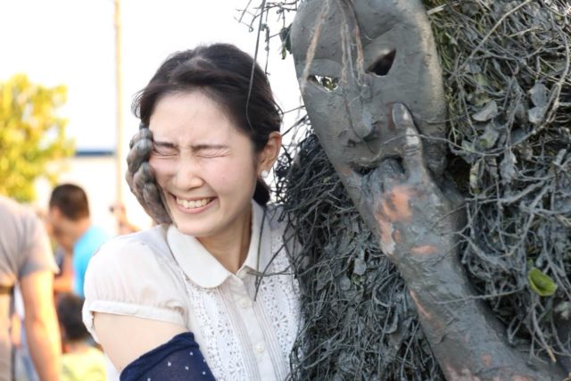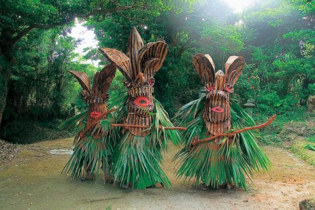 悪石島のボゼとは、盆の時期にトリオで現れ、死霊臭の漂う盆から人々を生の世界へ導くとも、悪霊を祓うとも言われています。赤土と墨で塗られた異形の面を被り、ビロウの葉の腰蓑を巻き、手首や足にシュロの皮をあて、手には男根を模したボゼマラという長い棒を持っています。