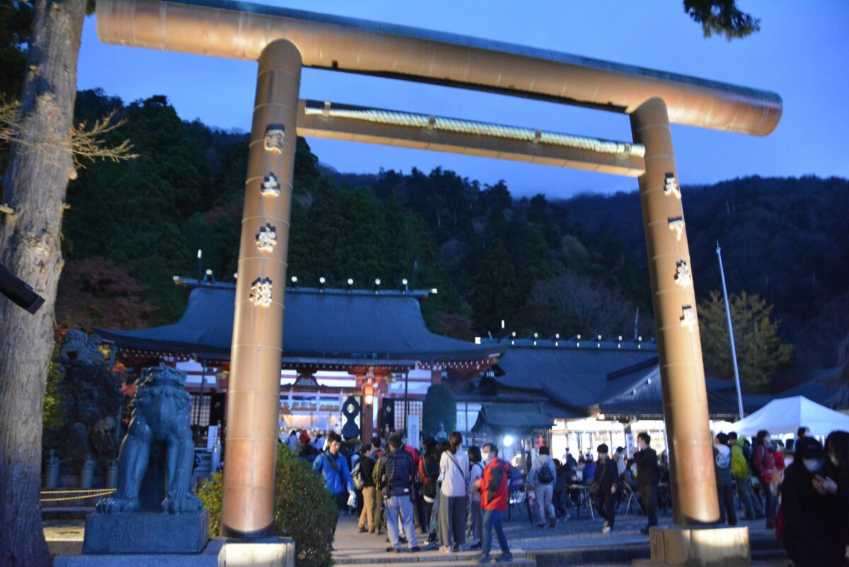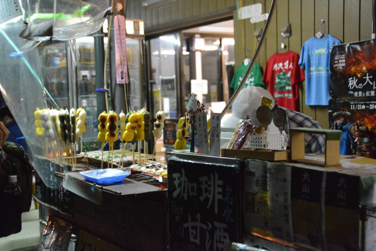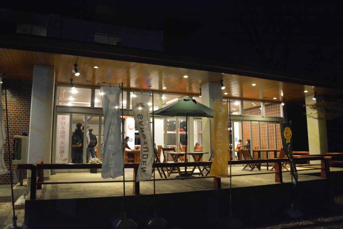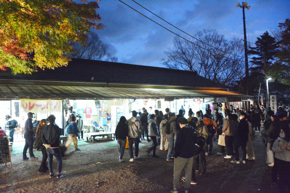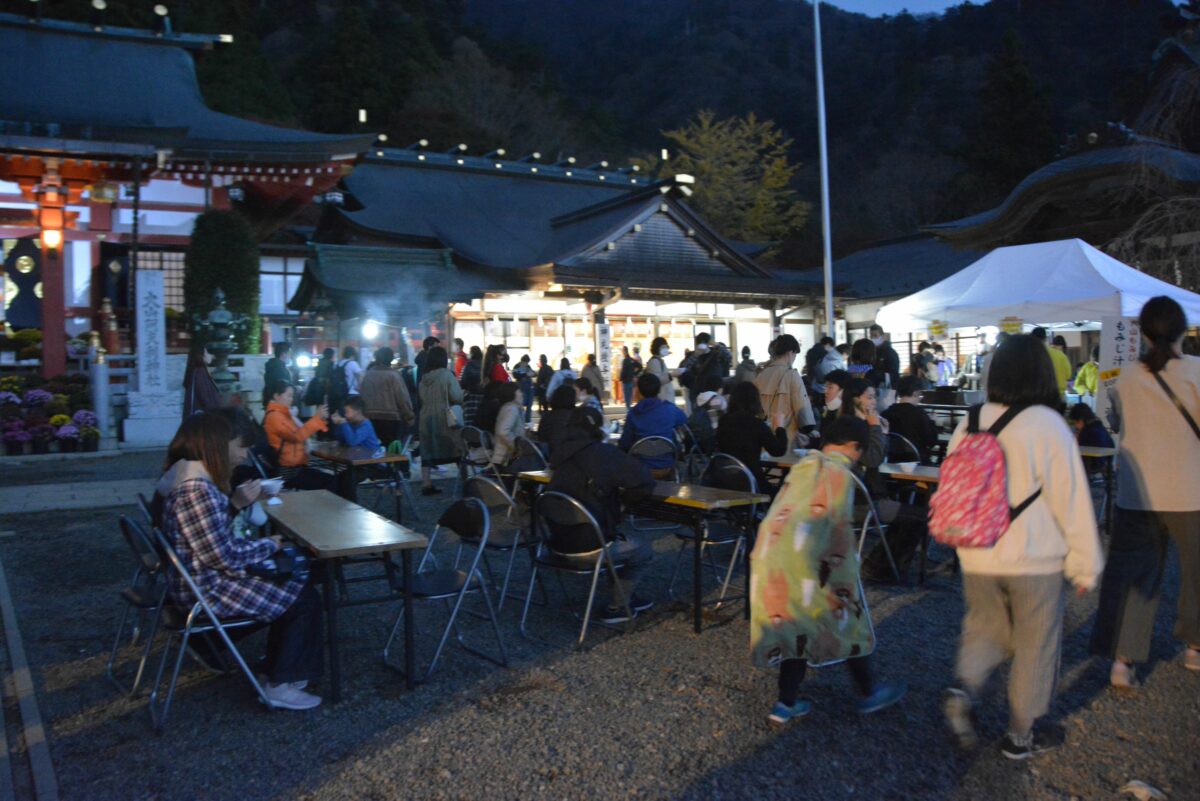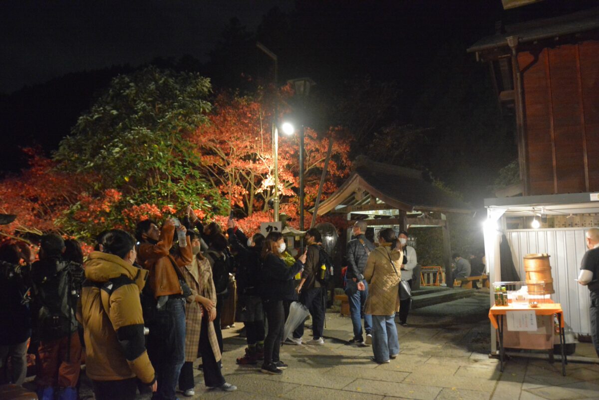 昼夜を問わず紅葉の彩りが包む阿夫利神社下社の境内には、飲食の設備も充実しています。