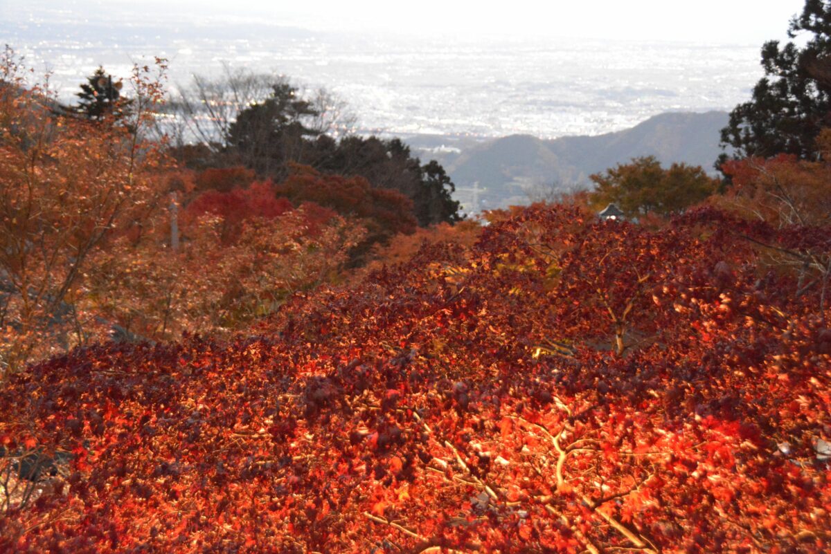 阿夫利神社下社の境内からは、紅葉越しに広がる眺望を楽しむことができます。