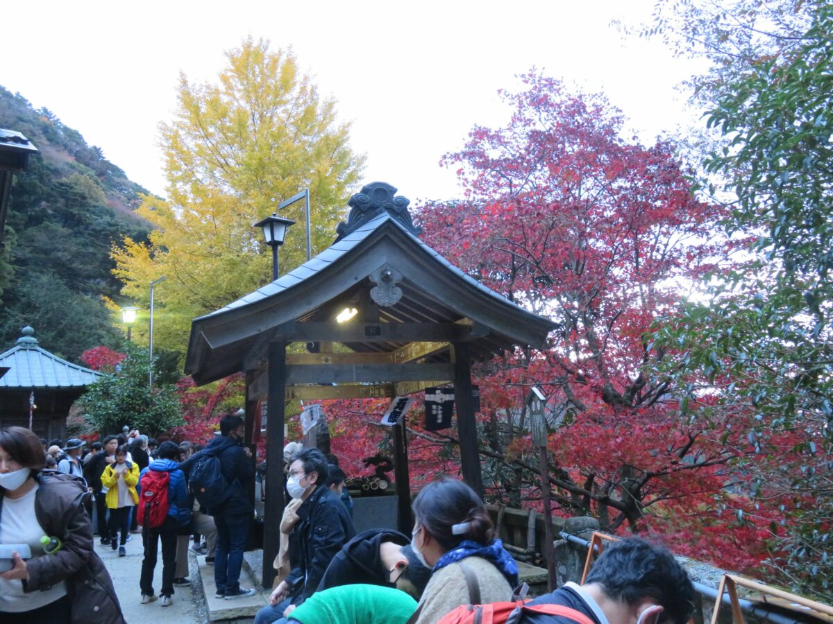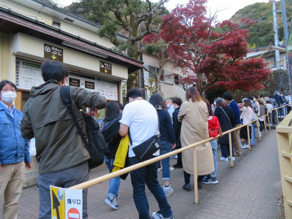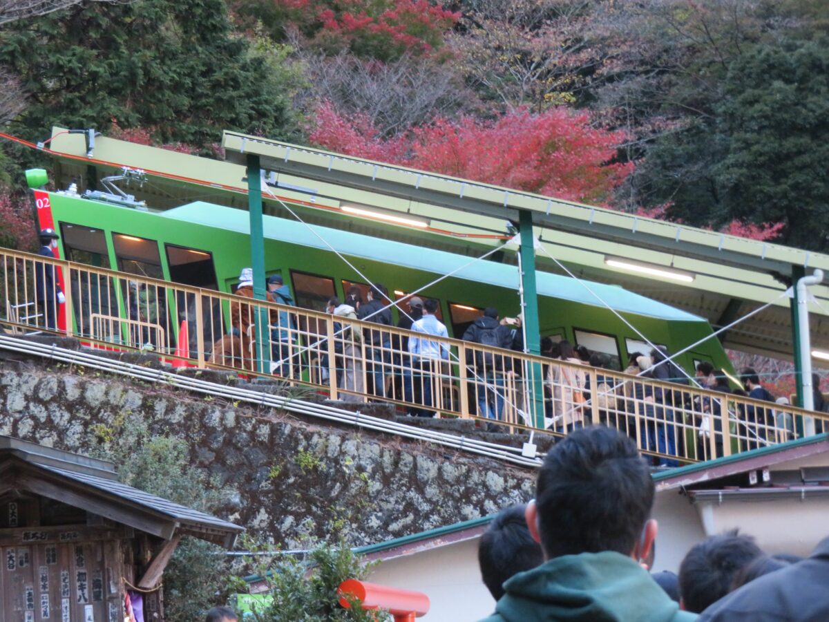 「こま参道」を約15分歩くと、ケーブルカーの乗場です。紅葉のシーズンは混み合います。乗車まで1時間以上、行列に並ばなければならないこともあります。密を避けることも難しいので、感染症が流行っている時期にはマスクの着用などが必須となることでしょう。