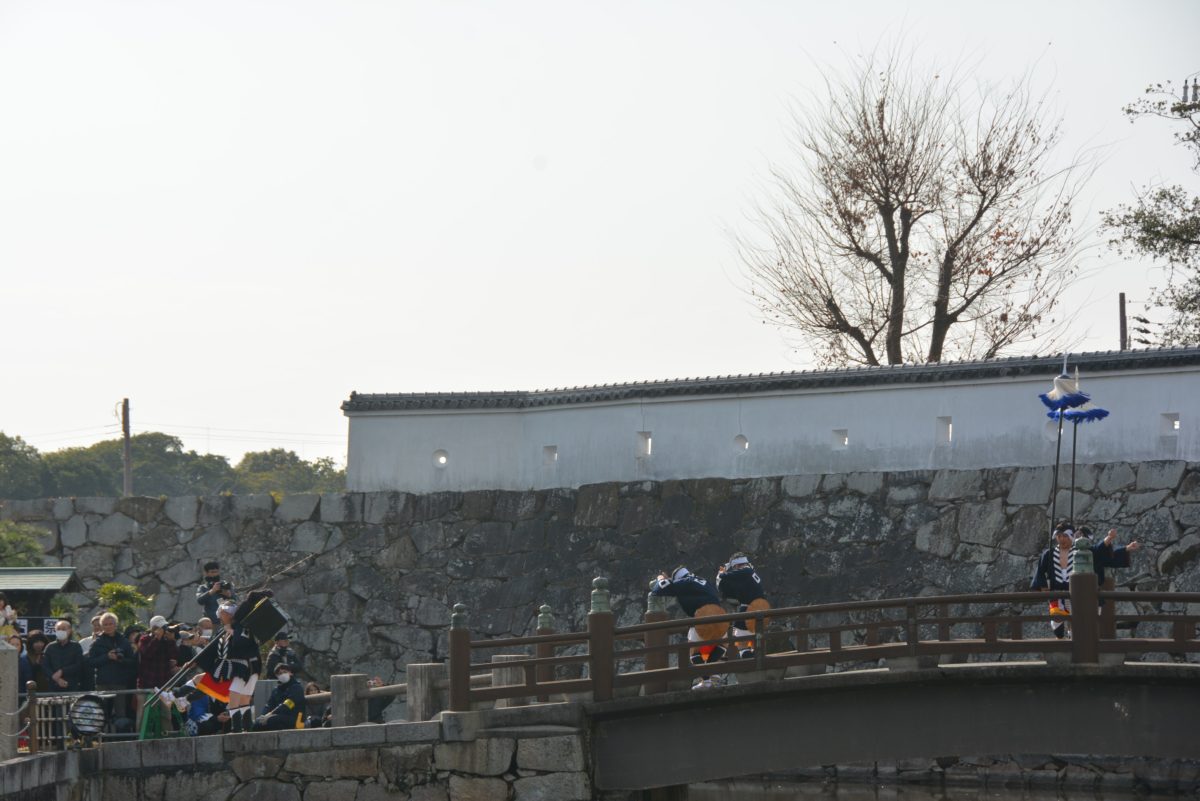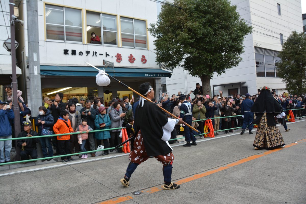 赤穂事件が起こる前は、赤穂藩も江戸まで大名行列を行っていたことでしょう。侍、姫君、若君、長持ち運び、槍持ち、腰元、駕籠などの長い行列が、赤穂城の大手門を出て市内を練り歩きます。長持運びや槍持ちなどの奴は、「奴振り」と呼ばれる独特なステップを踏みながら前に進む様子が特徴的です。駕籠の担ぎ手は、駕籠が揺れないように4人の呼吸をぴたりと合わせています。さらに見逃せないのが、槍持ちのパフォーマンスです。数メートル歩く度に前後の槍持ちが、ユニークな仕草で毛槍の投げ渡しを行います。