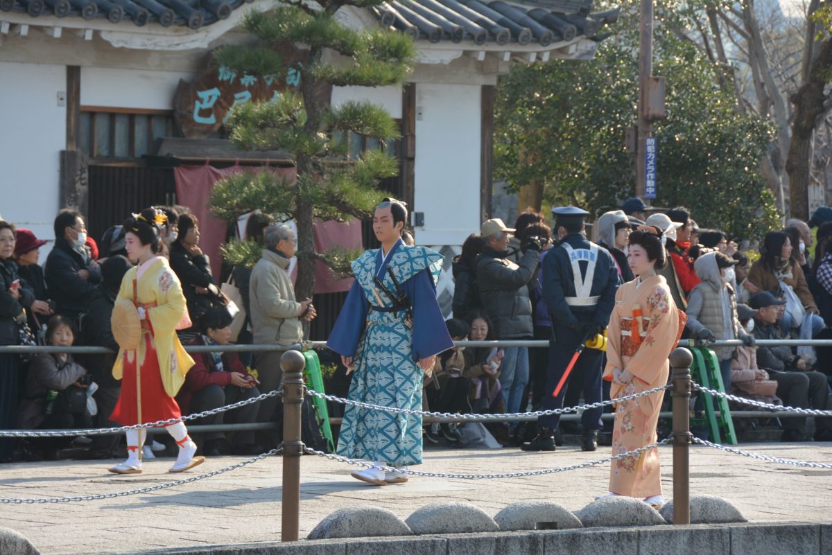 時は元禄から明治、令和にタイムスリップします。令和元年に赤穂市の観光キャンペーンガールに選ばれた赤穂義士娘が、人力車に乗ってお披露目をします。