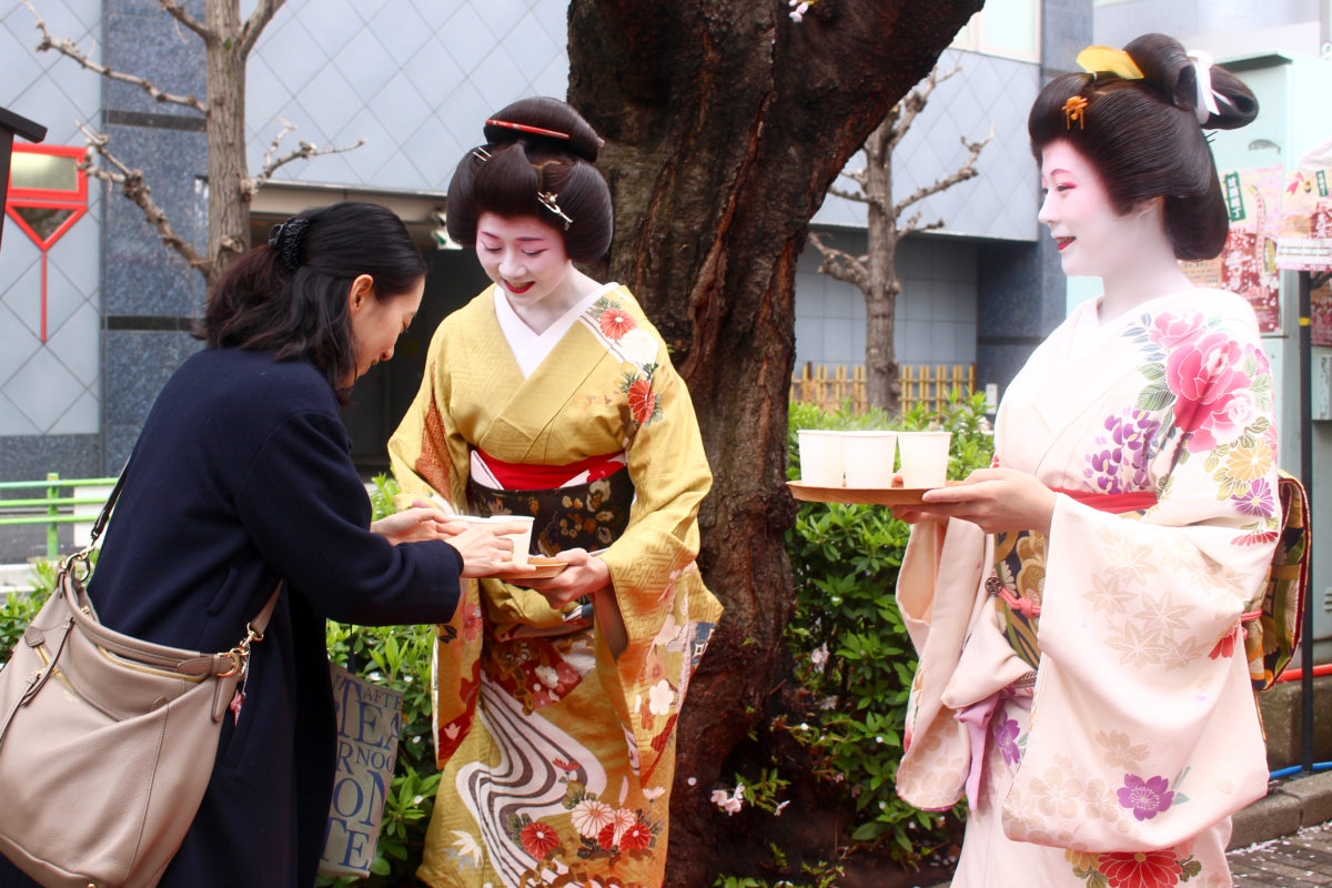 地元人形町の芸妓さんだそうで、人形町周辺の旧名に因んで「葭町芸妓」と言うそうです。甘酒を振舞いに、芸妓の八重さんと市松さんが来てくれていました!桜にお二人がさらに花を添えて風流な雰囲気をつくってくれますね!