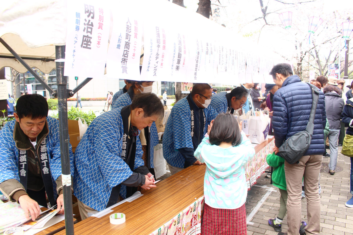 桜並木へ入ってみると、抽選を引く人でものすごく長い行列ができていました。一等は明治座のペアチケットと言うのも地元密着の甘酒横丁らしくていいですね!