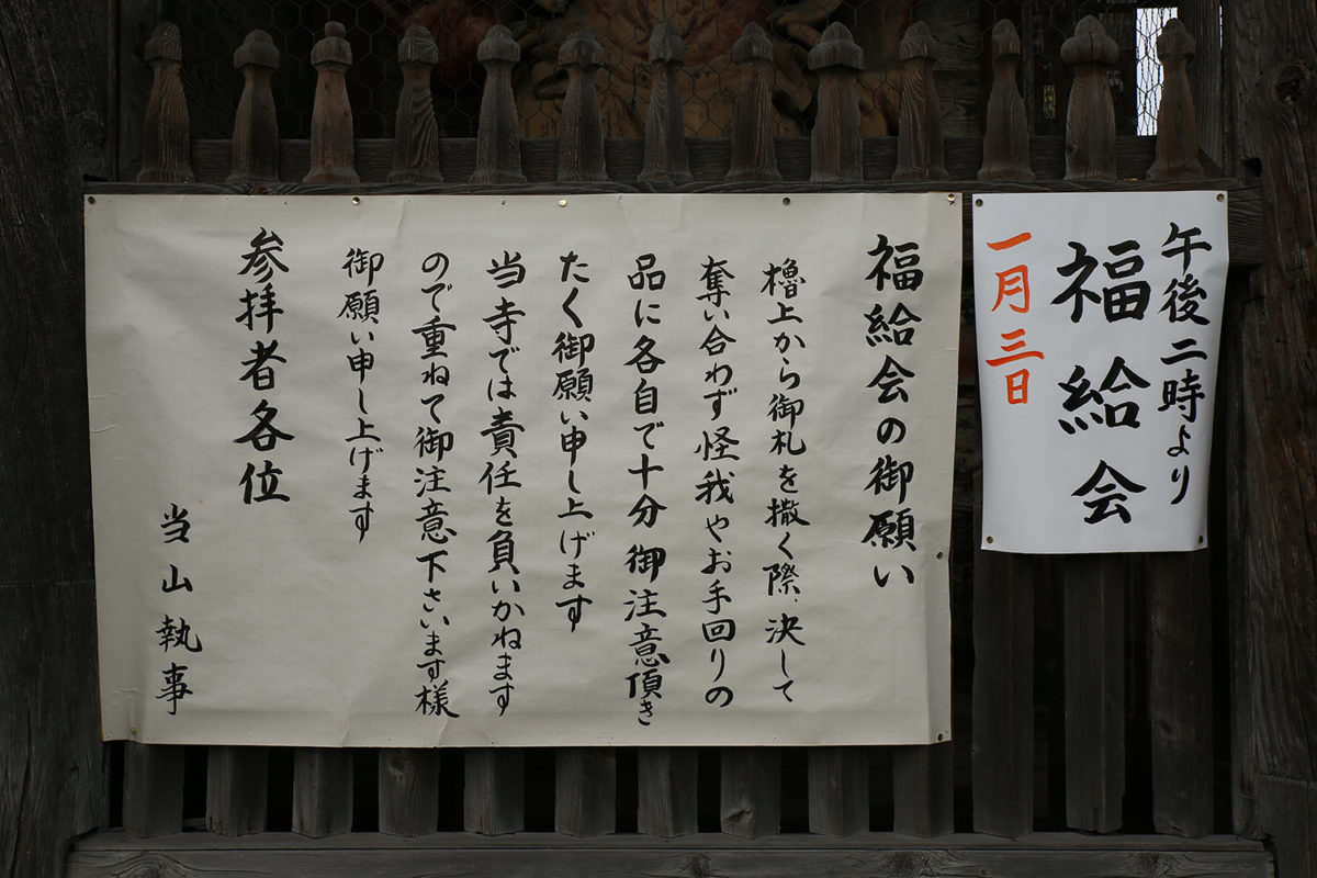 毎年1月3日は「福給会(ふくたばえ)」は13:00から本堂の中で法要が行われます。戸が閉まっているため、中は見えませんが大般若経600巻をダイナミックにめくる転読で天下泰平や万民豊楽を祈願している声が境内にもれ聞こえてきます。