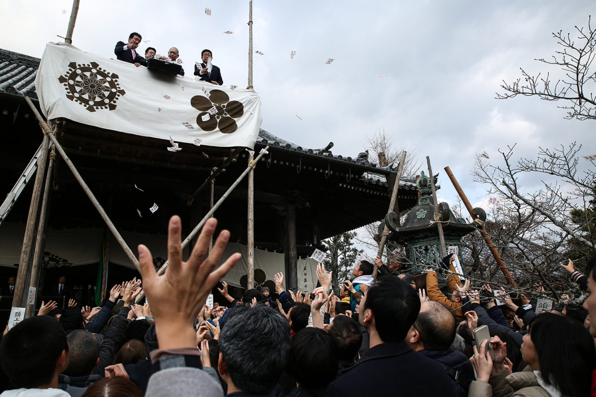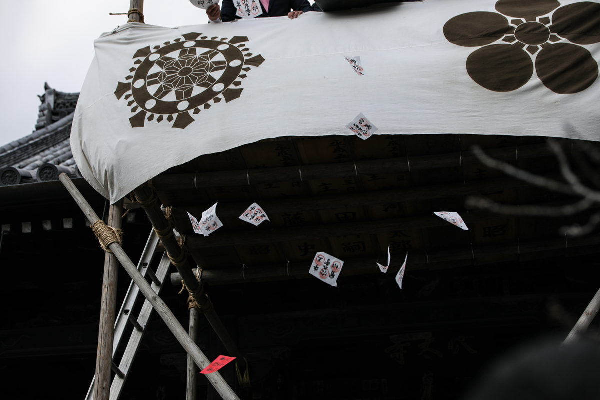 5mほどの高さの櫓の上で住職たちが団扇であおいで福札を飛ばします。