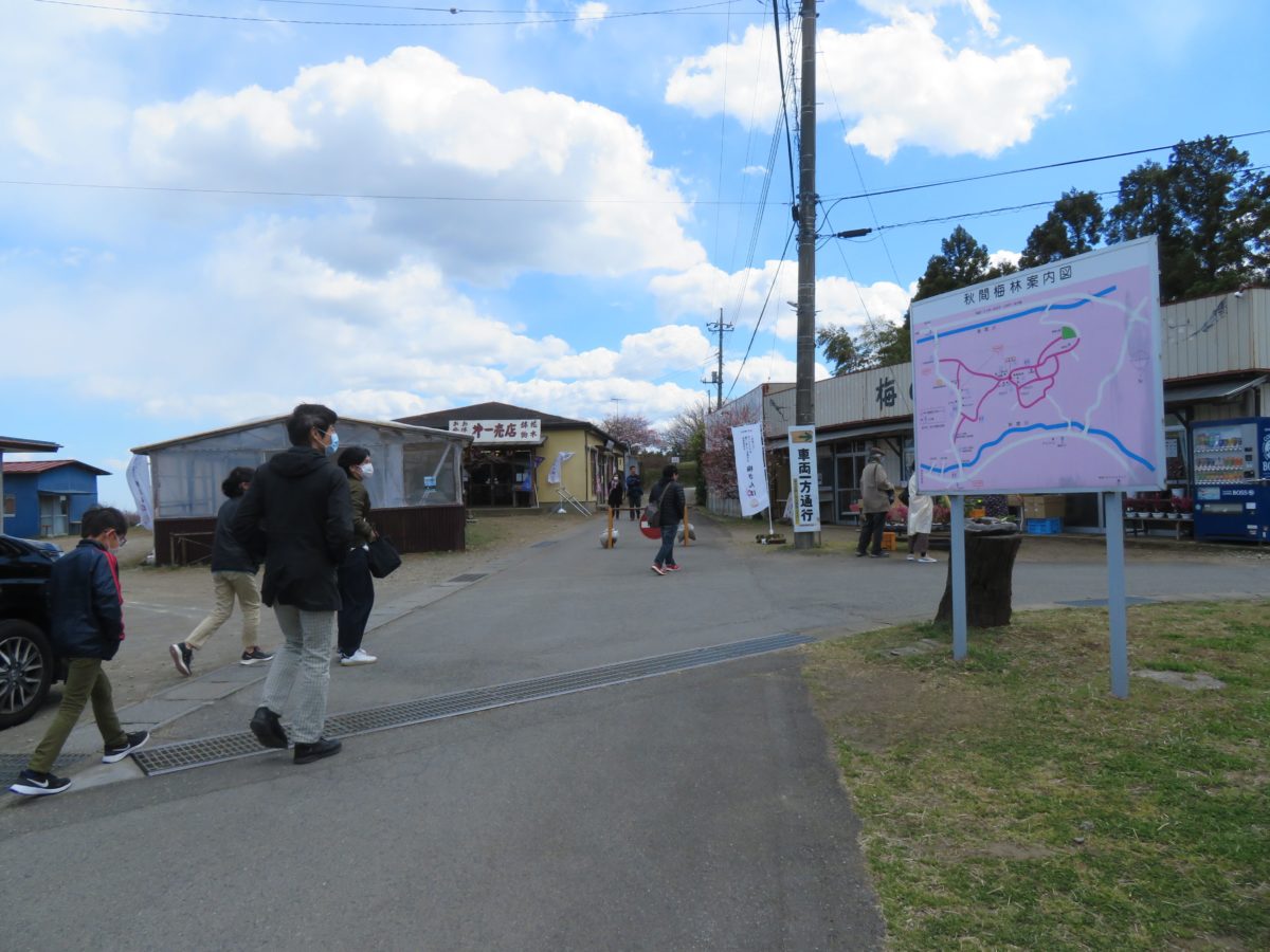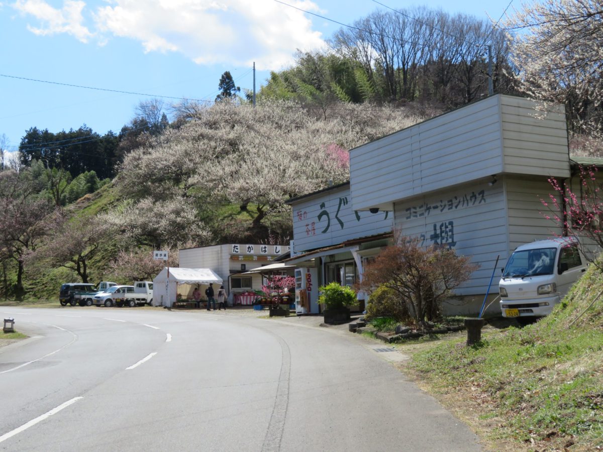 2020年の「秋間梅林祭」のイベントは全て中止となったのですが、頂上の広場や三軒茶屋のエリアでは、各々数店舗の売店兼飲食店は休まずに営業していました。様々な梅の加工食品ばかりでなく、梅の枝を販売する店もあります。