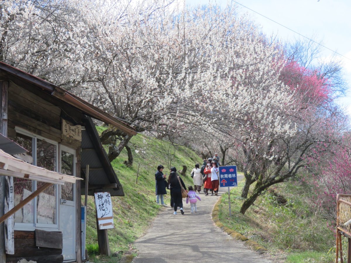 群馬県の西端に位置する安中市の郊外に広がる秋間梅林は、群馬三大梅林の一つに数えられ、例年2月中旬から3月下旬にかけて「秋間梅林祭」が開催されています。梅林の麓の三件茶屋から頂上まで歩きやすい遊歩道が整備され、甘い香りが漂う中をゆっくり散策することができます。梅を利用した食品のバラエティーも豊富で観梅の合間に楽しむグルメも魅力に溢れます。