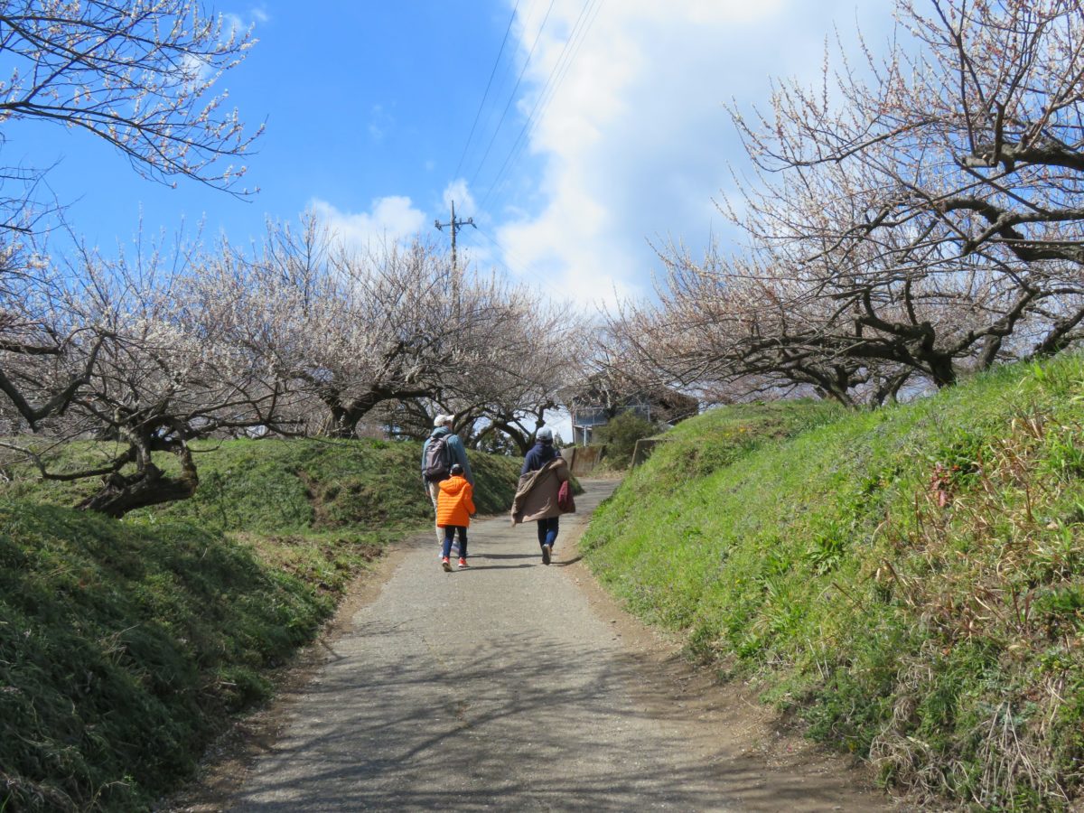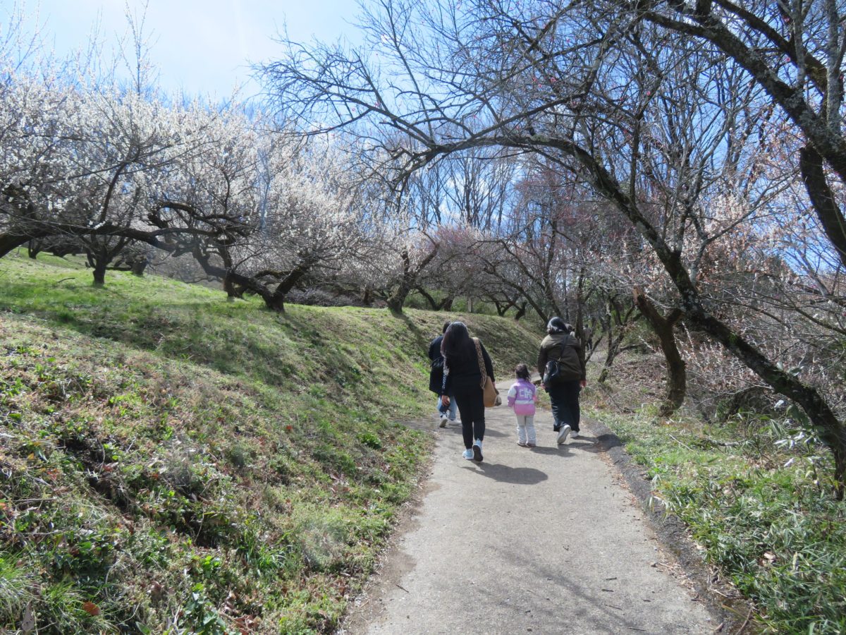 遊歩道の傾斜はなだらかで舗装されているので坂道も苦にはなりません。遊歩道の左右には紅白の花をつけた梅の木が延々と続きます。