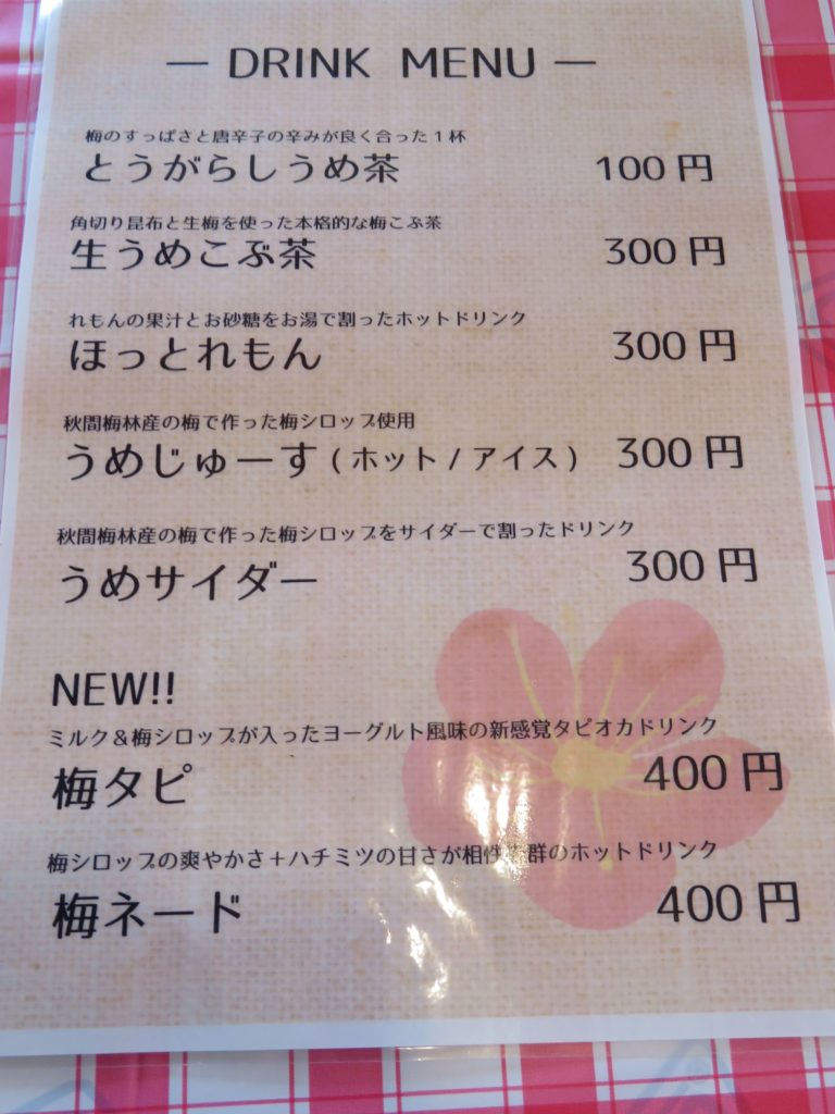 秋間梅林の中で営業する飲食店のメニューは極めて豊富です。梅こぶ茶を無料で配布する店もありました。梅風味のドリンクや、季節限定の秋間梅林弁当、上州名物のおきりこみなどを味わうことができます。